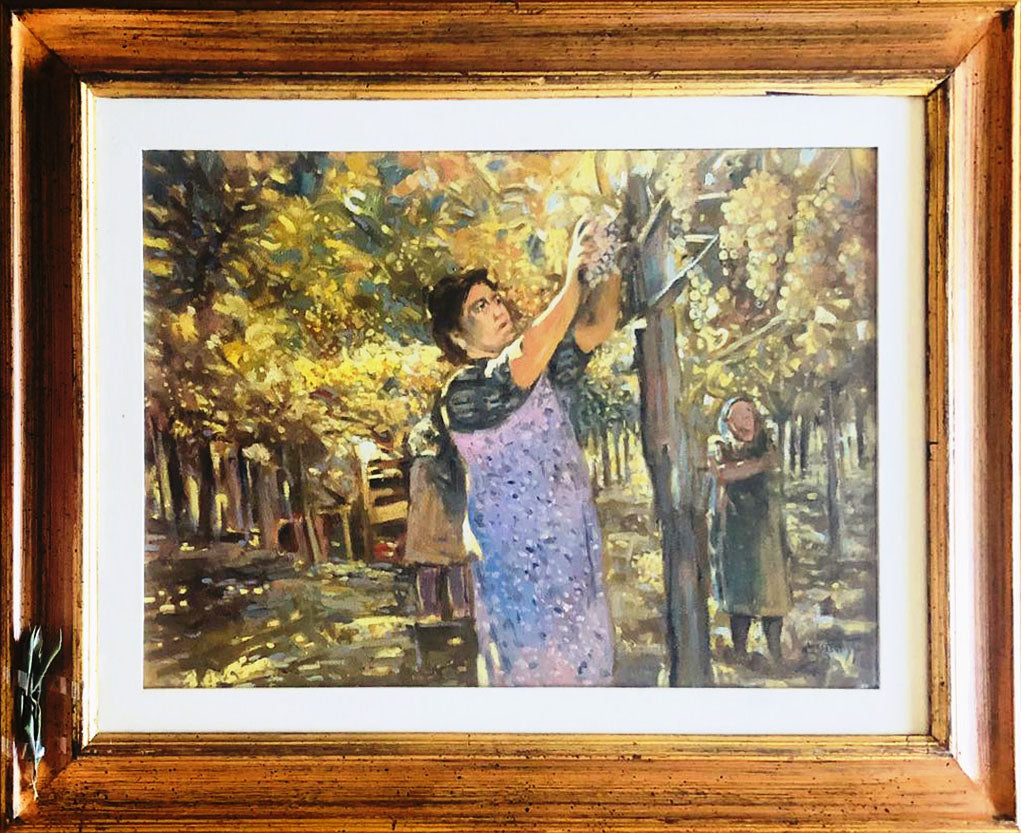 As we can see from this work, the style of painter Salvatore Miglietta is based on a marked naturalism that nevertheless seeks to interpret reality expressively. The scene of work in the fields is depicted in great detail, without subjective filters. Formally, however, the artist uses a very wavy brushstroke that accentuates the dynamism of the entire scene, capturing every vibration of light on the objects. This is a phase in Miglietta's work that harks back to a post-Impressionist aesthetic.