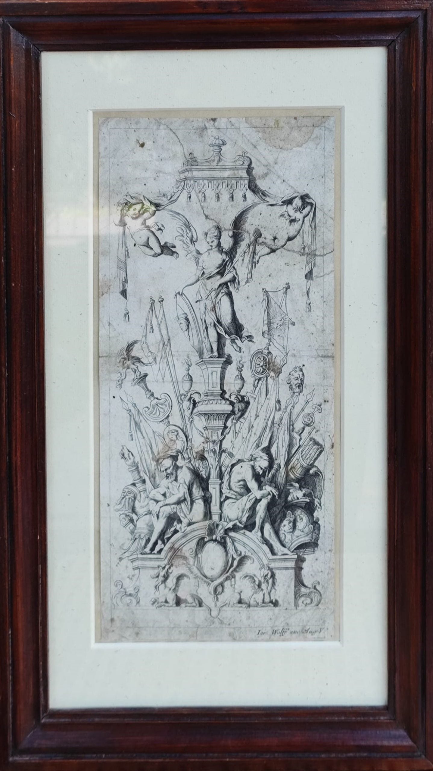 El grabado presenta una Victoria alada en el centro, una figura dominante encaramada sobre una elaborada estructura arquitectónica simétrica. La Victoria sostiene un escudo y un asta de bandera, símbolos de triunfo y gloria, mientras dos putti gesticulan juguetonamente sobre ella, completando la escena con una ligereza dinámica. La composición está adornada con cabezas de cabra y dos ánforas flameadas simétricamente colocadas. En la base de la obra, dos figuras masculinas de luto, probablemente representando esclavos o conquistados, se sientan a los lados, dentro de un marco arquitectónico curvo y ricamente decorado. Este marco está coronado por fantásticas bestias aladas.