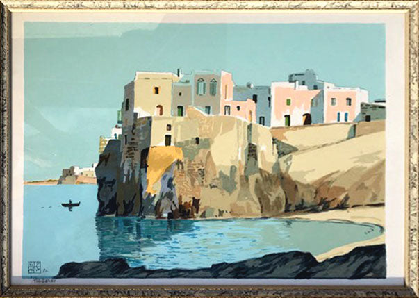 Aldo Riso è un maestro nel riprodurre la sua terra, la Puglia, e, più in generale, gli scorci dell'Italia Meridionale. Lo fa con un'impostazione tradizionale che lo ha condotto a sposare un realismo semplice ma efficace, fatto di luoghi solitari e pieni dil luce. In questa acquerello si può notare come la caratteristica principale dei paesaggi di Riso, sia un uso intenso del bianco. Il bianco della luce, che si riflette sulle pareti delle case, predomina nella composizione, quasi trasfigurando la realtà. Ciò permette all'artista di comunicare il calore della sua terra, attraverso l'uso di cromie piene di vibrazioni luminose.