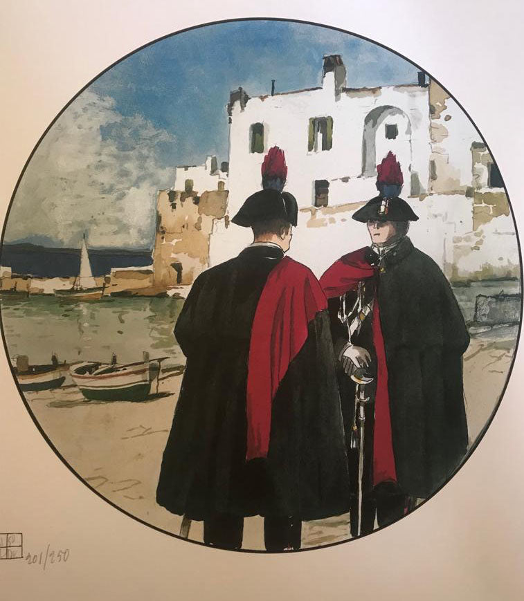 Aldo Riso è un maestro nel riprodurre la sua terra, la Puglia, e, più in generale, gli scorci dell'Italia Meridionale. Lo fa con un'impostazione tradizionale che lo ha condotto a sposare un realismo semplice ma efficace, fatto di luoghi solitari e pieni di luce. In questa serigrafia si può notare come la caratteristica principale dei paesaggi di Riso, sia un uso intenso del bianco. Il bianco della luce, che si riflette sulle pareti delle case, predomina nella composizione, quasi trasfigurando la realtà. Ciò permette all'artista di comunicare il calore della sua terra, attraverso l'uso di cromie piene di vibrazioni luminose. In questa opera l'artista fornisce una variante in cui lo sfondo paesaggistico/marinaro meridionale funge da sfondo per la vivace rappresentazione di due carabinieri in divisa.