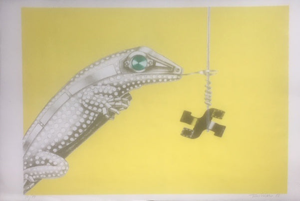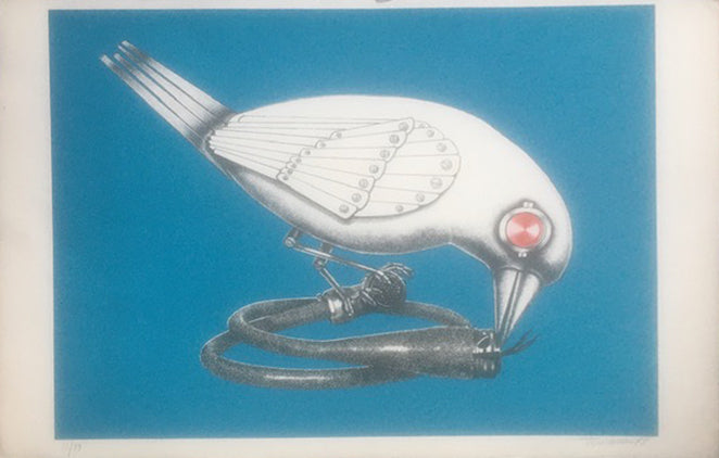 Aldo Turchiaro ha una speciale predisposizione alle raffigurazioni di animali che interpreta con il suo stile personale. I soggetti di Turchiaro si pongono a metà strada tra una rappresentazione naturalistica, che propende verso una raffigurazione dettagliata, e una rielaborazione più creativa del soggetto che guarda ad una sorta di trasformazione meccanomorfica degli animali. In queste due litografie l'uccello e la lucertola sono composti da lastre metalliche fissate da viti e bulloni, così come le loro prede sono tramutate, creativamente, in manufatti tecnologici. Ci troviamo, dunque, di fronte ad un processo di devitalizzazione del soggetto che va a tutto vantaggio della composizione, permettendo a Turchiaro di dare libero sfogo alle proprie eccellenti doti di disegnatore. L'esecuzione, infatti, presenta un aspetto formale perfetto e ricco di dettagli, idoneo all'estetica surrealista-meccanica che connota questi soggetti.