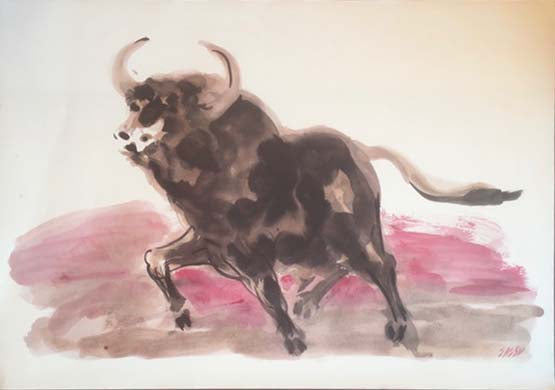 Le rappresentazioni di animali nell’arte hanno origini antichissime, tanto da comparire anche sulle pitture rupestri di epoca primitiva. Per questioni di culto vari tipi di animali compaiono nelle testimonianze di diverse civiltà di epoca antica. E’ soprattutto nel medioevo, nell’ambito del Gotico Internazionale, che le raffigurazione di animali si diffondono come veri e propri ritratti dal vero, sia all’interno di opere o nei quaderni di disegni e bozzetti. La presenza degli animali come soggetti nell’arte rimarrà costante fino all’epoca contemporanea. Nella produzione di Aligi Sassu, tesa all'espressione di forze dinamiche incontenibili, gli animali, soprattutto i cavalli, compaiono spesso allo scopo di rappresentare quelle forza scaturite dal movimento. In questo caso l'artista milanese si cimenta nella rappresentazione del toro un s oggetto che ha origini antichissime, tanto da comparire anche sulle pitture rupestri di epoca primitiva. Per questioni di culto compare spesso anche nelle testimonianze delle civiltà antiche, in particolar modo quella Minoica-cretese. Nell’arte contemporanea sono celebri gli studi sulla figura del toro effettuati da Picasso.