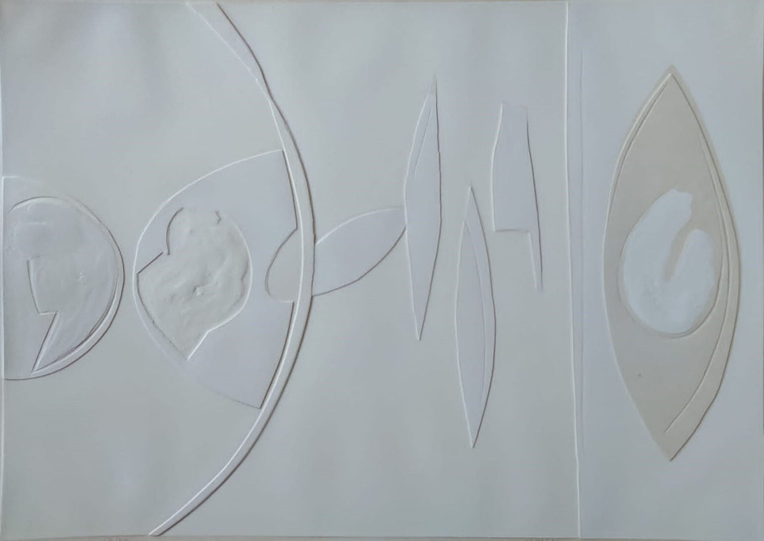 Questa litografia è davvero esemplare della ricerca condotta da Angelo Savelli a partire dagli anni '60. L'artista sceglie di fondare la sua indagine percettiva totalmente sulla forma dell'oggetto artistico. Per questo egli rinuncia completamente al colore, immergendo l'opera in un monocromo bianco. Su questa superficie pura si esplica il gioco di rilievi che, quasi come i tagli di Fontana, incidono l'opera e vi introducono la realtà concreta tramite la tridimensionalità. Dal punto di vista estetico, questi lavori di Angelo Savelli, risultano di grande impatto, nel minimalismo astratto ed elegante dei rilievi che si adattano perfettamente all'essenzialità del bianco.