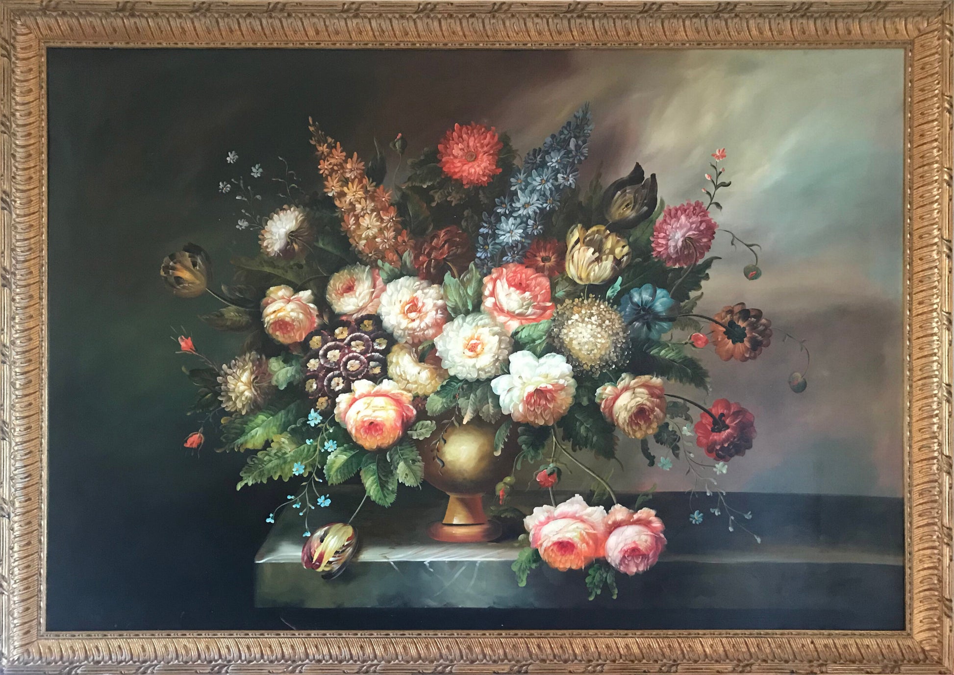 La peculiarità più rilevante di questa opera consiste nel fatto che viene raggiunto un perfetto equilibrio tra mimesi e lirismo. Infatti alla base del linguaggio sostanzialmente figurativo dell'artista autore troviamo, indubbiamente, una perfetta resa naturalistica dei fiori. Il pittore si distingue per la riproduzione perfetta di ogni singolo petalo, anche con una certa consistenza plastica e una conseguente determinazione dello spazio all’interno del dipinto. Allo stesso tempo, però, la forza espressiva del suo stile risiede essenzialmente negli interventi pittorici. La pennellata è viva, di ispirazione impressionistica, pronta a registrare sui fiori e sul vaso ogni singola vibrazione luminosa o atmosferica.