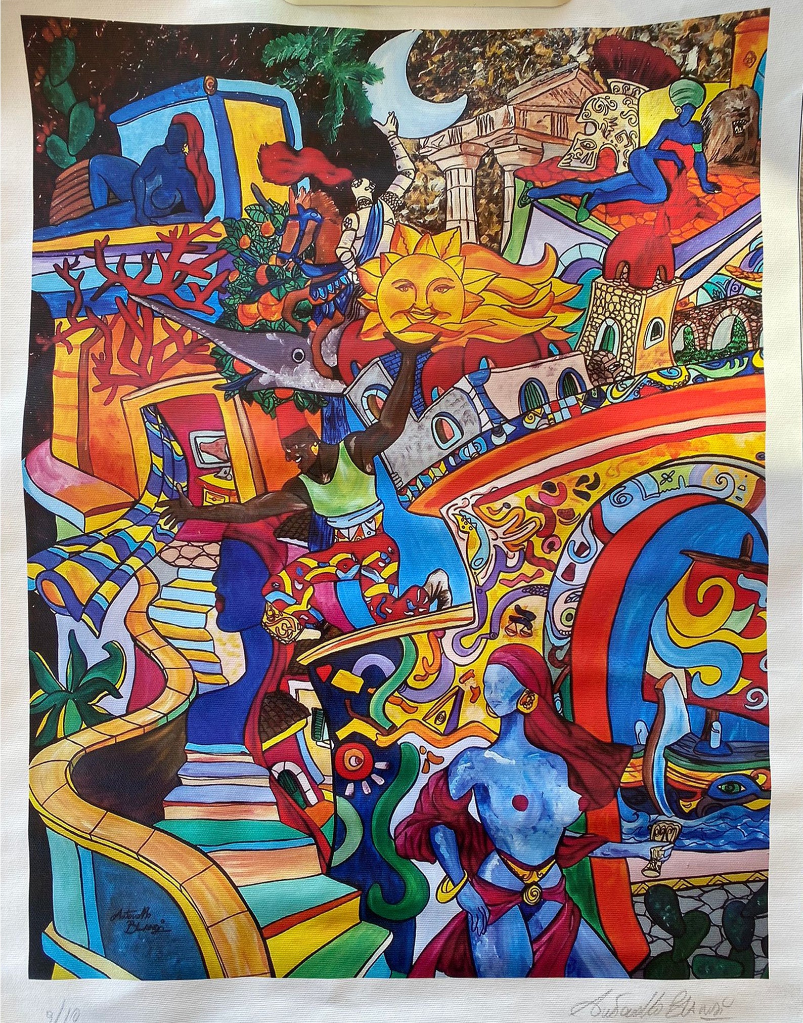 Un paesaggio onirico e sospeso, dove forme architettoniche fluttuano in uno spazio indefinito. In alto, un sole radiante illumina la scena, mentre una scala sinuosa si snoda fluidamente verso l’alto, suggerendo un viaggio simbolico. Tra le strutture sospese, emerge una figura femminile in primo piano: una statua eterea, priva di volto definito, ma resa viva da un maestoso turbante rosso. L’opera si distingue per un tratto fluttuante e dinamico, con colori intensi e vibranti. Le forme si mescolano tra astrazione e simbolismo, creando un’atmosfera sognante e surreale, tipica di Blandi. L’uso della luce e dei contrasti cromatici enfatizza il senso di movimento e sospensione. Antonello Blandi è un artista siciliano che attraverso le sue opere racconta il fascino e l’anima della sua terra. I suoi dipinti richiamano i colori accesi del Mediterraneo e la magia dei borghi marinari, trasformandoli in visioni poetiche e sognanti. Il suo modo di dipingere unisce realtà e immaginazione, creando immagini che sembrano ricordi, impressioni di luoghi vivi nella memoria più che rappresentazioni fedeli.