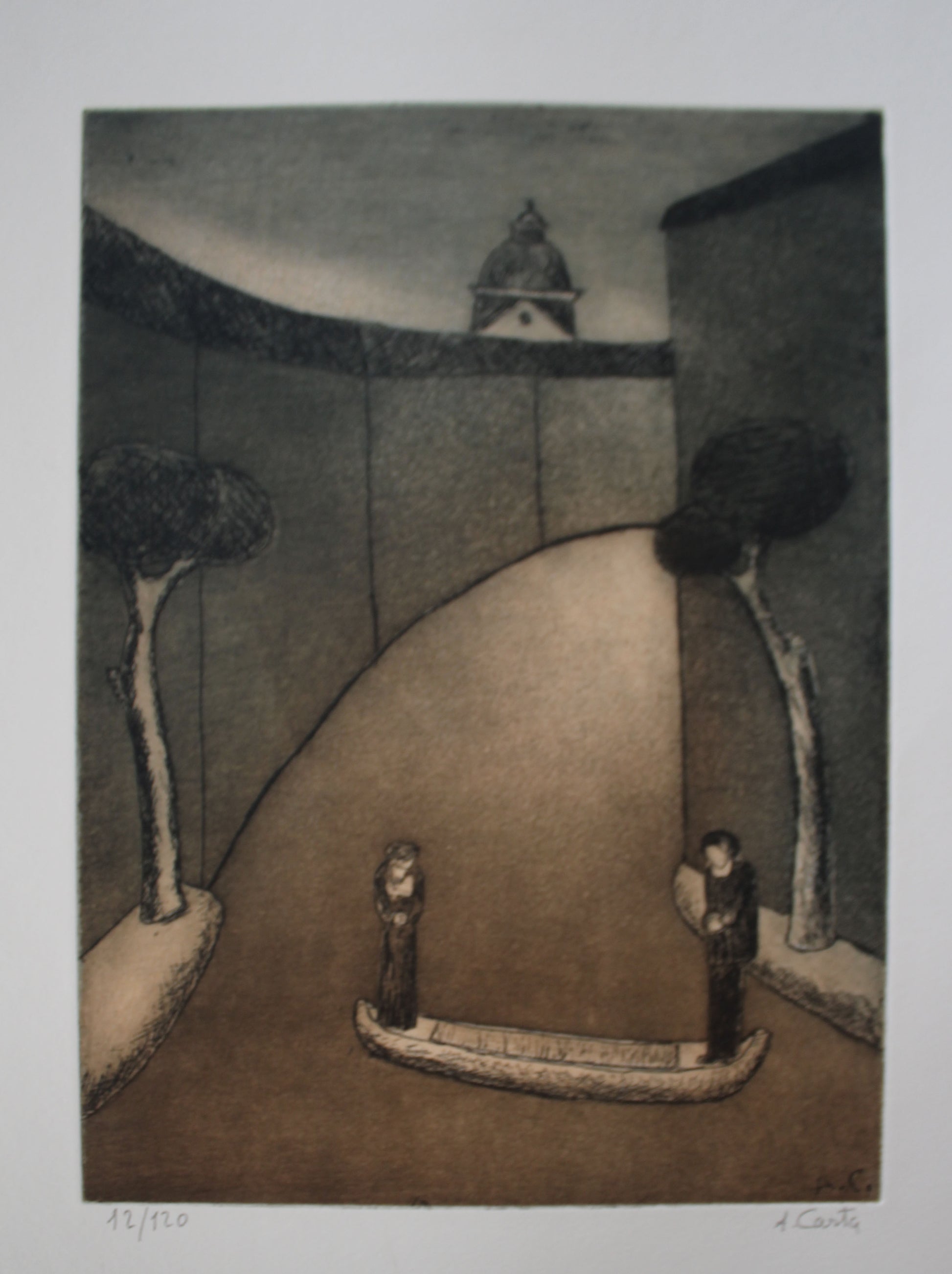 La stampa è molto esemplare del linguaggio artistico di Antonio Carta, basato su una semplificazione della realtà fenomenica in un'ottica quasi surreale. In questo caso l'artista crea uno spazio impossibile: le pareti indicano una prospettiva priva di logica e la strada percorre una curva non plausibile. Caratteristico è il tratto nero molto marcato e lo stile, quasi da illustrazione, della rappresentazione.