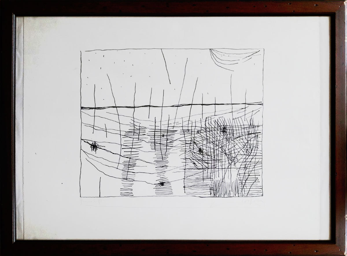 In questa prova d'autore l'artista Antonio Corpora dimostra di essere aperto anche ad un linguaggio astratto in cui la realtà fenomenica viene ricostruita mediante un'elegante stilizzazione geometrica. Così con la raffinatezza che possiamo trovare in alcune composizioni di Paul Klee un paesaggio viene trasformato in un equilibrato sistema di linee orizzontali e verticali. La composizione monocromatica, a livello formale, viene condotta con un esile grafismo che accentua il carattere segnico, e dunque enigmatico, dell'opera.