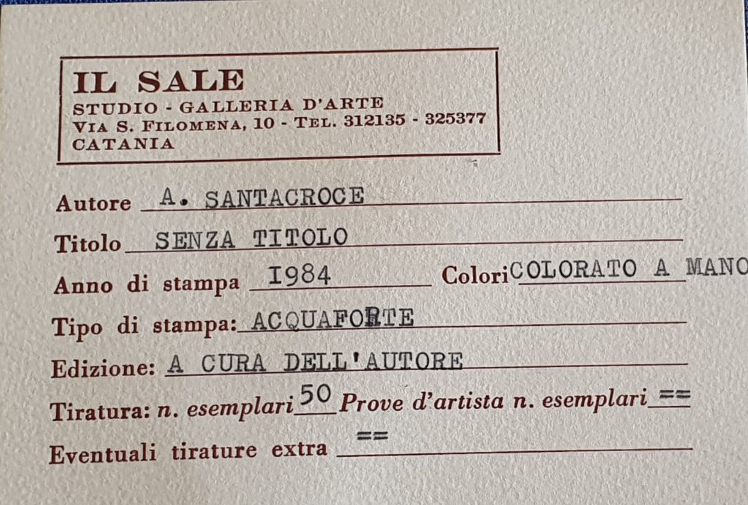 Antonio Santacroce artista poliedrico che spazia dalla pittura, all’incisione, alla scultura, e alla scenografia, nasce a Rosolini nel 1945. Si avvicina al mondo artistico grazie ai disegni che il padre utilizza per illustrare i suoi scritti di satira politica e dai bozzetti tratti dalle storie dei paladini di Francia, dipinti presso la bottega da “Don Giuorgi u pitturi”, rinomato pittore di carretti siciliani del territorio. Nel 1958 frequenta una Scuola di artigianato artistico serale, dove apprende le tecniche del mosaico e delle vetrate. Nel 1963 ottiene una medaglia d’oro per la pittura all’Istituto Gemmellaro di Catania. Nel 1969, si trasferisce a Roma, dove entra in contatto con artisti svizzeri tra cui J. Gachnang che lo introduce nel mondo dell’incisione. Trasferitosi in Svizzera, lavora come operaio presso la ferriera di Wohlen e, nel frattempo, frequenta i musei di Zurigo, Basilea e Berna, spostandosi anche ad Amsterdam e Delft. Tornato a Catania, nel 1971 studia la storia dell’arte, della matematica e della geometria, per approfondire le “proporzioni armoniche” che metterà in atto nelle sue opere artistiche. Insegna al Liceo Artistico di Catania e incide le sue prime acqueforti ed acquetinte su un torchio Brissè, l’unico a quei tempi, presente nella Sicilia orientale; viaggia in Germania e Svizzera, studiando grandi artisti come Bellmer, la Kollwitz, Klee e Kandinsky. L'arte del Santacroce si muove tra una costruzione armonica, che deriva dallo studio della classicità antica giungendo poi alle strutture di Klee accogliendone il segno dinamico, realizzato attraverso continue sovrapposizioni. Nel 1989 insegna al Liceo Artistico di Zurigo della Kantonsschule Freudenberg e dal 1991 vive e lavora tra Svizzera e Italia.