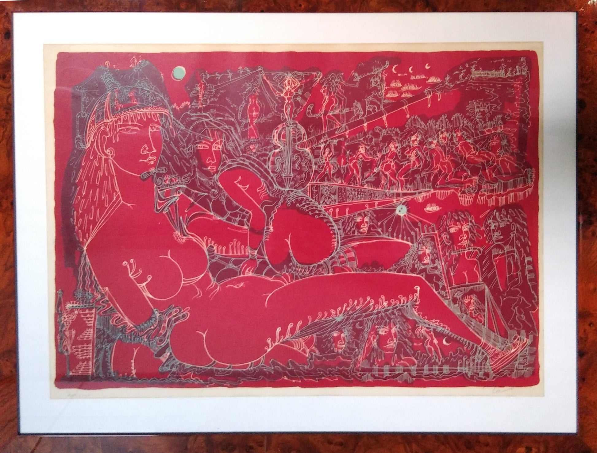 Siamo di fronte ad un’opera che ci narra l’universo femminile visto tramite gli occhi di Tono Zancanaro. In primo piano abbiamo una figura distesa sul fianco, che ci ricorda le grandi odalische, da Ingres passando da Manet per arrivare a Fiume. Il secondo piano invece riporta su vari piani prospettici figure femminili e strumenti musicali, accostando così le curve muliebri a quelle di vari strumenti a corda. La grafica è caratterizzata da un horror vacui, e non rimane spazio libero, affollando invece l’intero spazio con le piccole figurazioni grottesche di vari tipi.