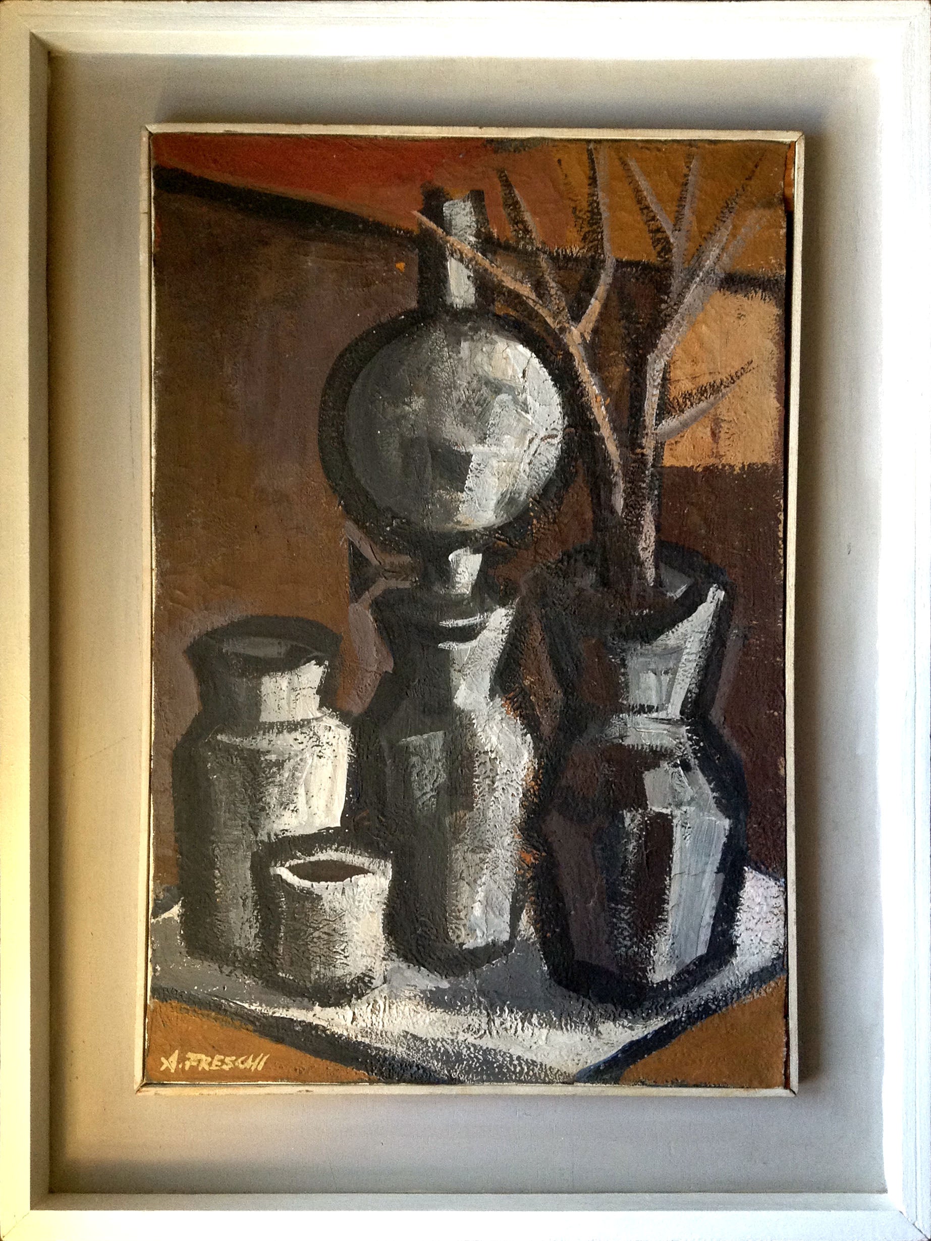 Il genere della “Natura Morta” vede la luce agli inizi del XVII secolo. Consiste nella rappresentazione di composizioni di soggetti inanimati, nella maggior parte dei casi fiori o frutta. Se all’inizio della sua storia era un’occasione per i pittori per cimentarsi in una riproduzione fotografica della realtà, con l’arte contemporanea la “Natura Morta” diventa anche un modo di interpretare la realtà, come per i cubisti o Giorgio Morandi. Questa Natura Morta di Attilio Freschi, come testimoniato dal catalogo, ha partecipato alla Mostra Premio del Fiorino del 1965, presso Palazzo Strozzi a Firenze.