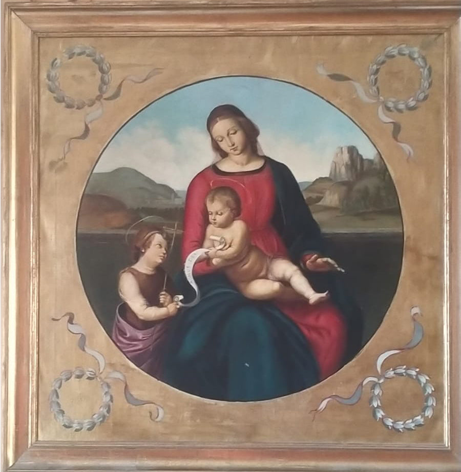 Il soggetto è una copia d'autore della Madonna Terranuova, un dipinto eseguito da Raffaello Sanzio tra il 1504 e il 1505 e conservato alla Gemaldegalerie di Berlino. Il tema iconografico parte da quello fondamentale per l’arte sacra occidentale, ovvero la Madonna col Bambino in cui viene aggiunta la variante del piccolo San Giovanni Battista. Esso è riconoscibile poiché porta già i suoi attributi iconografici tradizionali, ovvero la veste di pelle di animale ed il bastone con la croce. La presenza del San Giovanni Battista è un allusione al sacrificio redentore di Cristo, già profetizzato in tenera età. Risulta chiaro che ci troviamo di fronte ad una scena del tutto idealizzata, in linea con le poetiche rinascimentali. Così come idealizzata è l’ambientazione in un paesaggio naturale perfetto, tipico della produzione raffaellesca e di tutto il Rinascimento maturo. La versione originale di Raffaello reca un altro putto sulla destra.