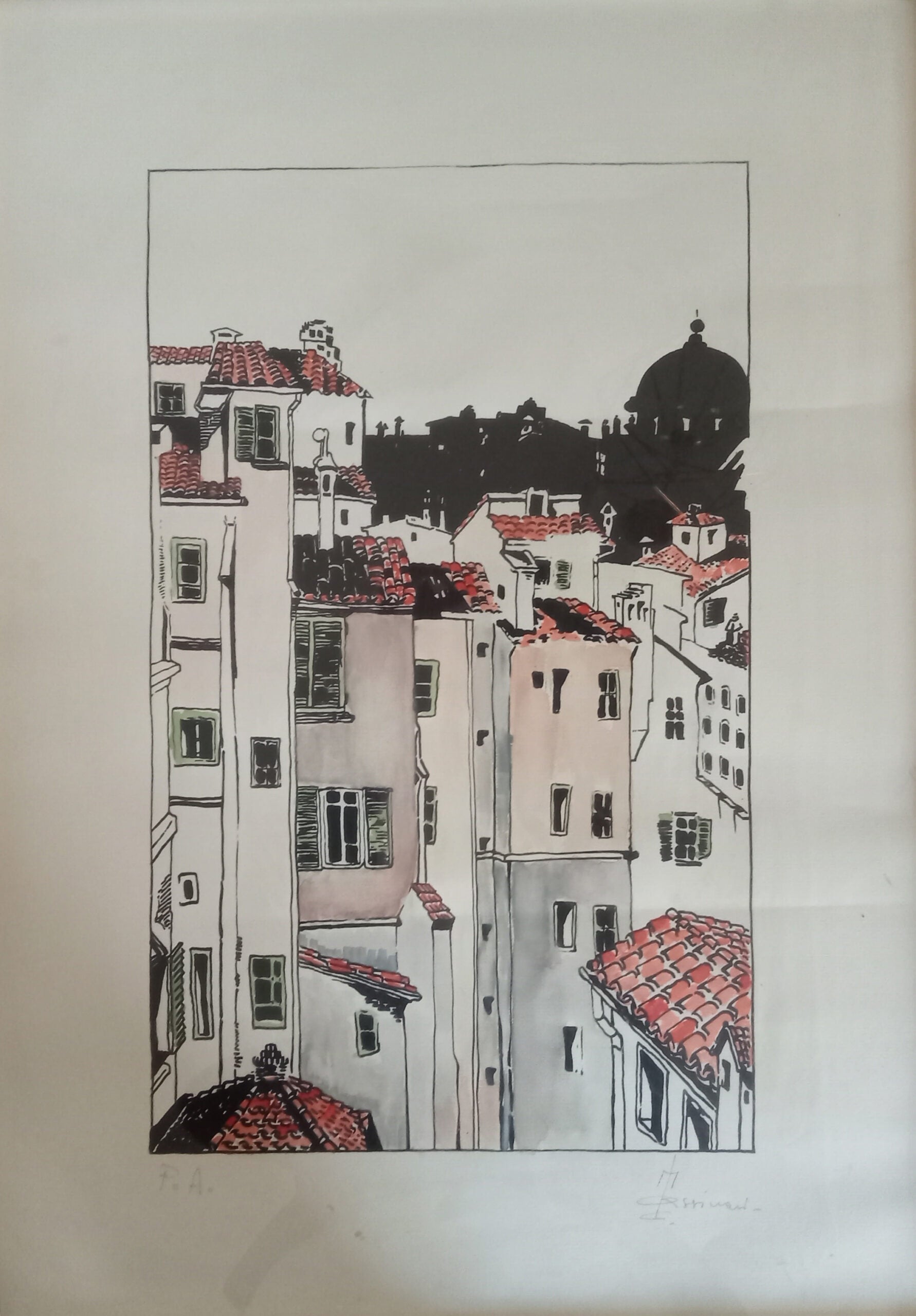 L’interpretazione della firma che si trova sulla grafica è T. Cassinari. Le ricerche ad oggi non ci hanno portato ad individuare la biografia dell’artista. Lo possiamo avvicinare a pittori come Guttuso, famoso per le sue opere che ritraggono i Tetti, ma anche Orfeo Tamburi, noto per le sue scenografie urbane.