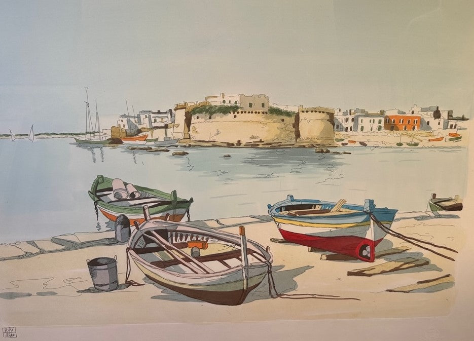 Aldo Riso nasce nel 1928 a Santa Maria di Leuca, nella Provincia di Lecce. Egli consegue una laurea in Giurisprudenza, ma al contempo approfondisce, sin da giovanissimo, l’approfondimento della pittura, eseguendo principalmente acquerelli. Profondamente legato alla sua terra fa della Puglia il suo soggetto preferito, ritraendone numerosi scorci sia della sua regione che del Sud Italia. Il suo esordio di fronte al pubblico avviene nel 1956 con al sua prima mostra, la quale dà il via ad una lunga carriera che gli permette di esporre la propria arte oltre che in Italia anche a Colonia, Berlino, Vienna, Parigi, Philadelphia, Belgrado, Atene, Barcellona, Madrid, Montreal, Toronto, New York, Mexico City, Buenos Aires, Asuncion e in Sud Africa. La sua ricerca si caratterizza per una pittura chiara, intensa, solare, ove i paesaggi sono inondati dalla luce che solo l’acquerello può rendere nelle sue tipiche trasparenze, non trascurando però né la pittura ad olio né la grafica d’arte. Case, barche e pescatori respirano rarefatti e sospesi sotto cieli implacabili e davanti a mari cristallini. Aldo Riso muore a Roma nel 2008.