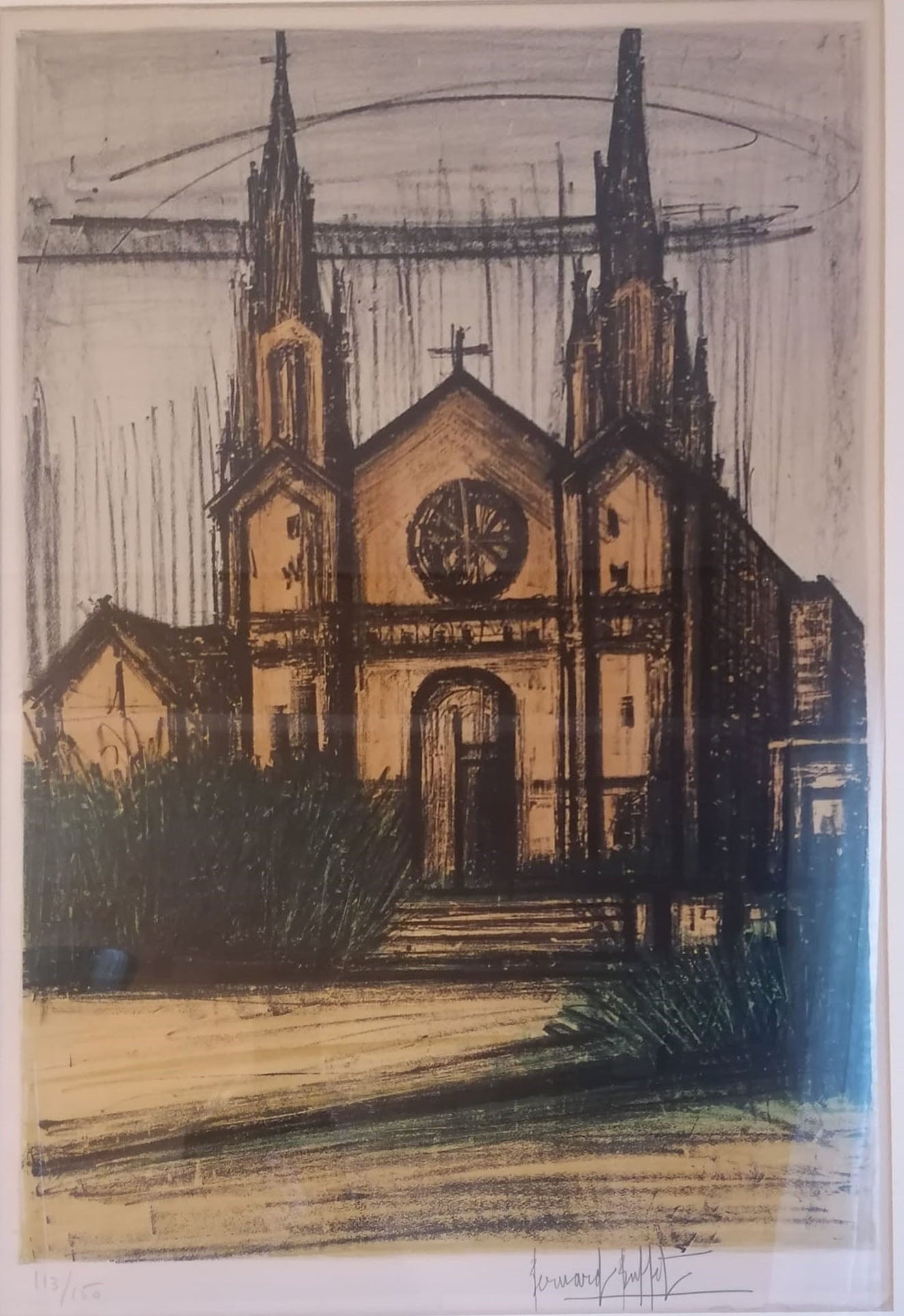 Le opere di Bernard Buffet presentano una marcata vocazione espressionista, ovvero che tende a porre l’accento sull’espressione delle emozioni. L’arte espressionista vuole gridare al mondo i propri stati d’animo e ostentarli con passione. Sul piano formale ciò si traduce in una resa sommaria delle figure, attraverso un tratto molto nervoso e movimentato, nonché nell’uso di una gamma cromatica violenta. Tali caratteristiche si trovano nelle avanguardie storiche dell’espressionismo, come il Fauvismo e, soprattutto, il movimento Die Brucke in Germania, al quale Buffet sembra rifarsi maggiormente. Infatti la caratteristica principale del suo linguaggio è il ritmo spezzato e angoloso della composizione che, però, nel caso di Buffet viene dettato da una caratteristica linea nera e spessa. È questa linea che sintetizza gli oggetti secondo una geometria rigida e spigolosa. Quella stessa geometria che determina lo spazio dell’opera, il quale sembra costruirsi proprio intorno al movimento spezzato degli oggetti. Nelle vedute urbane come la presente, tuttavia, Bernard Buffet sembra tenere la propria concitazione espressionista in un ordine compositivo più razionale, ispirato alla regolarità degli edifici e delle architetture.