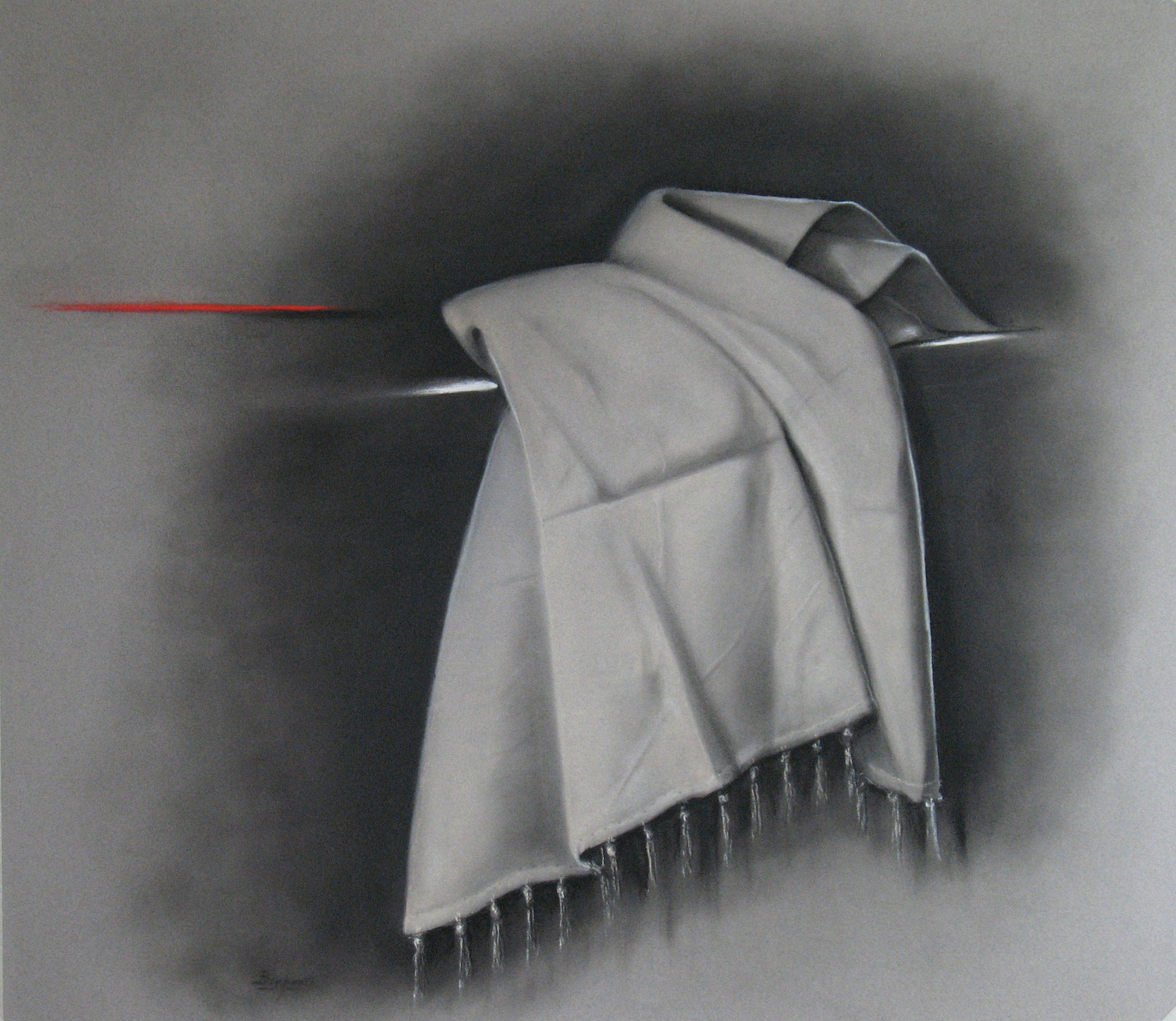 Nelle pieghe e nella posa accattivante di questo drappeggio con frangia, ho voluto indicare la caratteristica di colui che si presenta accondiscendente, di bell’aspetto, ben “truccato”, per ottenere privilegi e condizioni per una “ scalata sociale”, scendendo a compromessi, per il raggiungimento interessato di un proprio tornaconto. Colui che non si fa scrupolo nei comportamenti, di dimostrare ciò che in fondo non è. Il parallelo tra drappeggio e personaggio è sottinteso.