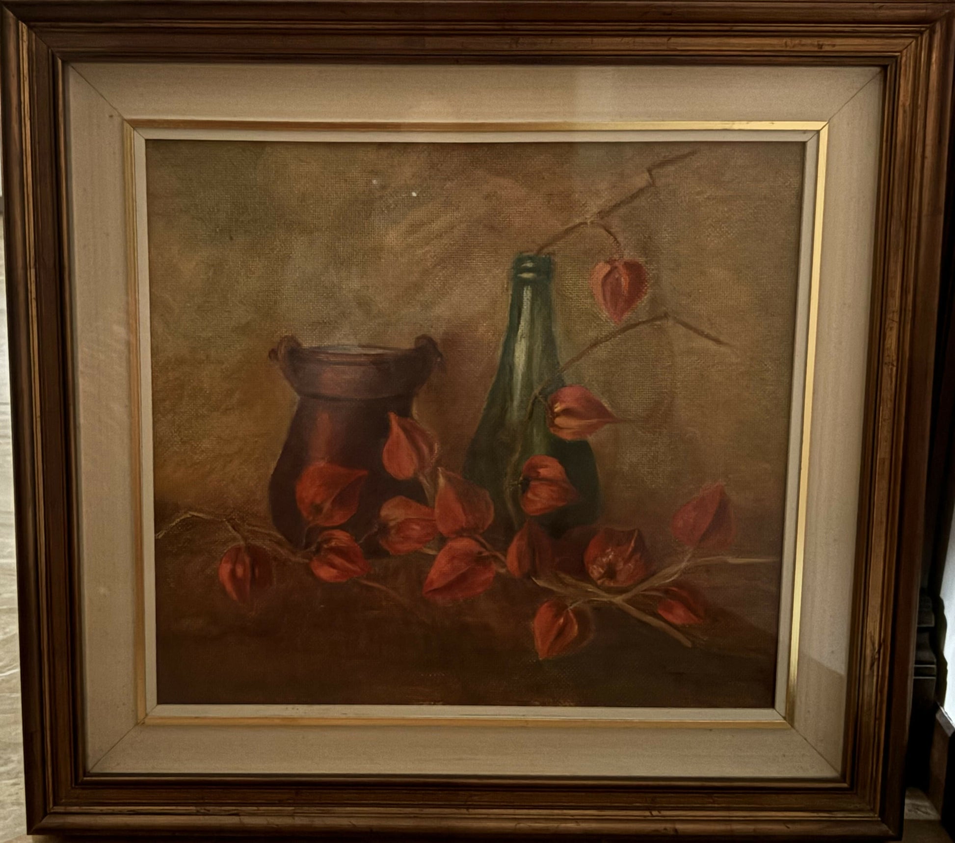 Una natura morta dai toni caldi e avvolgenti mette in scena vasi semplici e rami di alchechengi dal rosso intenso.