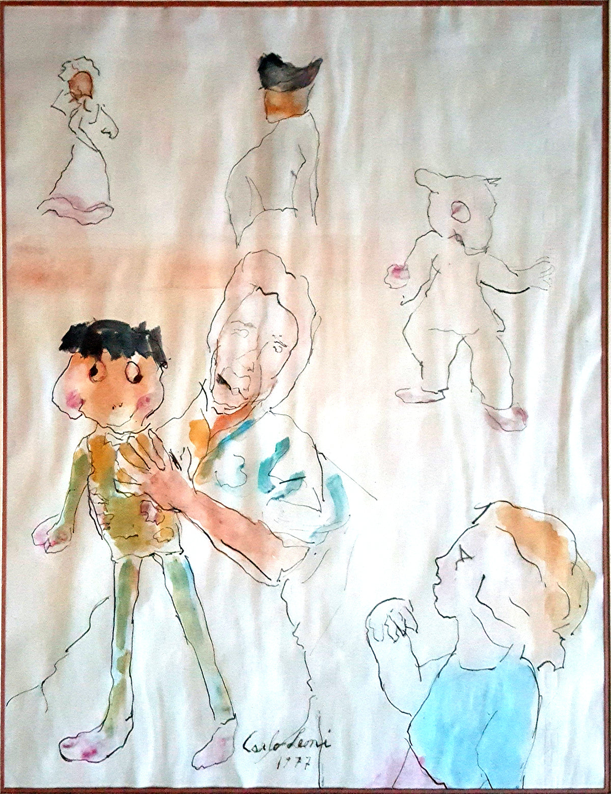 L'opera non mostra una vera e propria iconografia riconoscibile. Si possono individuare vari soggetti che non hanno un rapporto tra di loro. Ciò vuol dire che ci troviamo di fronte ad uno schizzo, o un divertissement improvvisato dall'artista su foglio. L'opera dimostra la qualità tecnica dell'artista bolognese Carlo Leoni, specializzato proprio nella realizzazione di disegni ad acquaforte ed incisioni. Anche da questo foglio si può notare come la sua capacità principale sia quella di sintetizzare le figure e dargli vita con pochi brevi tratti. La linea, essenziale e nervosa, riesce a rendere l'idea sia della forma dei soggetti che del loro movimento. Nell'opera in questione, inoltre, intervengono anche brevi pennellate di acquerello a ravvivare ulteriormente la composizione e ed aggiungere equilibrio cromatico. Carlo Leoni fu pittore scultore e incisore. La sua carriera artistica si sviluppò soprattutto nella città di Bologna ma espose in tutta Italia. La sua arte si contraddistingue per il suo interesse verso soggetti umili, ai margini della società
