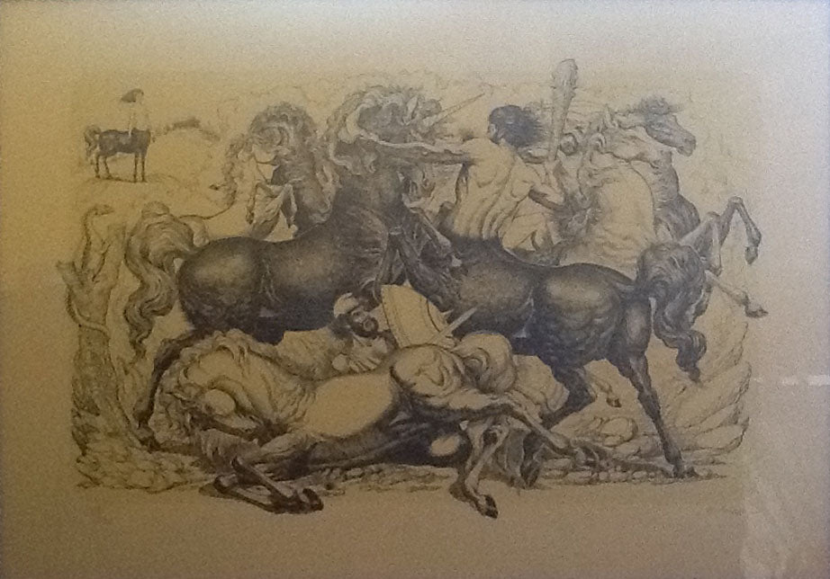 Il soggetto della Centauromachia (battaglia di centauri) risale all'epoca classica. Se ne trovano numerosi esempi in bassorilievi dell'arte greco-romana. Trattandosi di un tema iconografico classico ovviamente è stato ripreso anche nei secoli, soprattutto nel Rinascimento (famoso è un bassorilievo di Michelangelo conservato a Casa Buonarroti a Firenze). In questo caso Onesti dà una propria interpretazione fantastica in cui un centauro è impegnato in uno scontro con un unicorno.