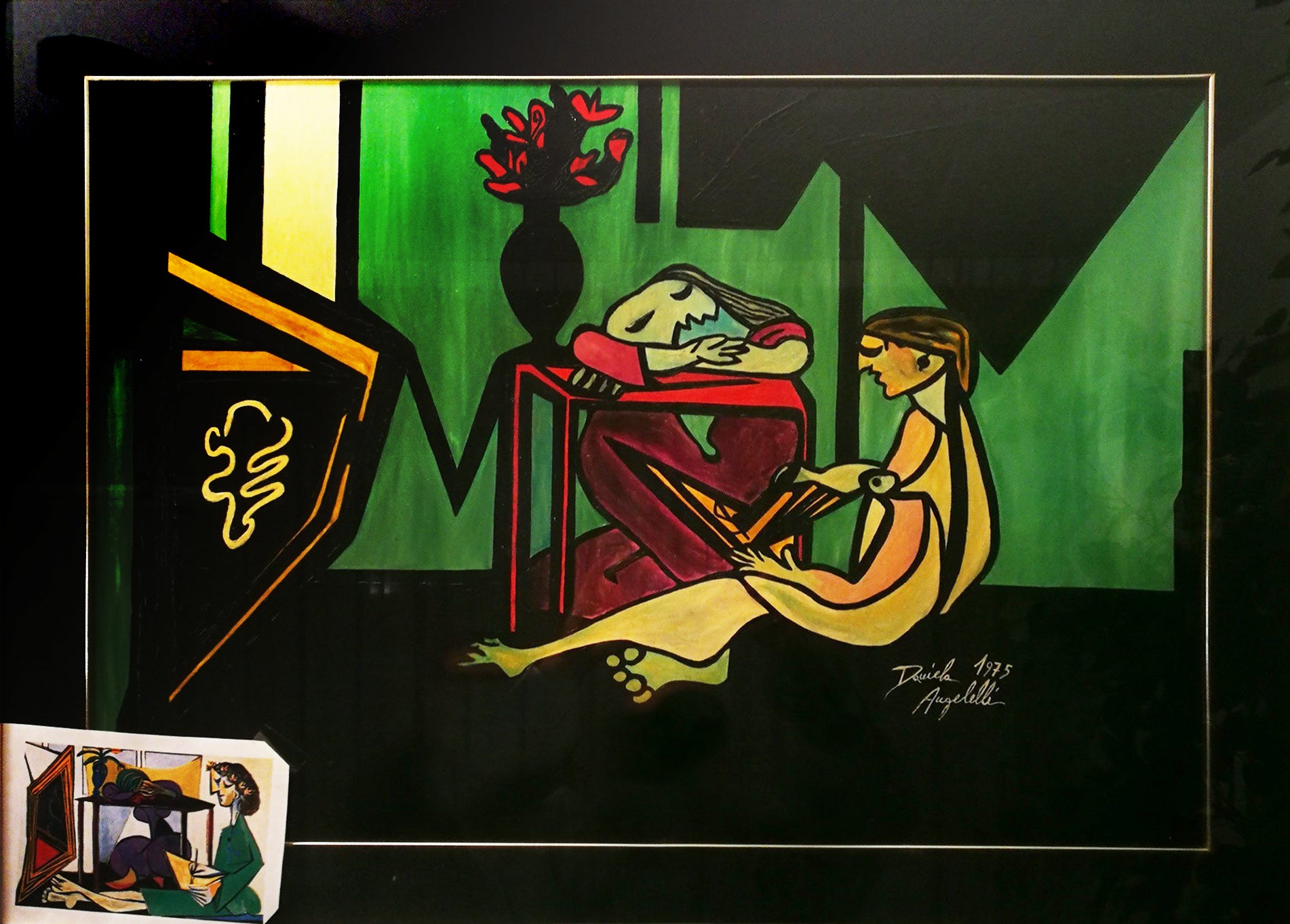 Nelle opere di Daniela Angelelli c'è una perfetta concomitanza tra realtà fenomenica e noumenica, tra oggettività e soggettività. L'artista lascia tutte le linee guida per individuare il soggetto, ma lo stravolge in una profonda indagine sulla vera essenza delle cose. Così lo spazio rompe la griglia prospettica, articolandosi su molteplici direttive. I soggetti invece subiscono una sintesi formale di tipo espressionista, venendo delineati da un largo tratto nero dal ritmo sinuoso. Il colore non ha qualità naturalistiche, ma ha una connotazione simbolica.