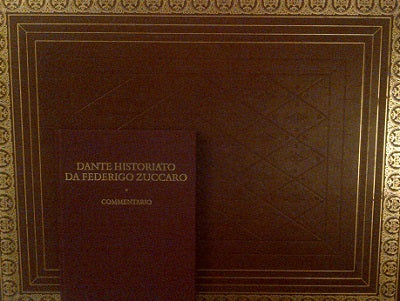La più imponente rappresentazione figurativa della "Divina Commedia" che sia stata mai realizzata. Opera di Federico Zuccari (1540-1609), è stata concepita e messa in atto tra il 1586 e il 1588, quando il grande artista marchigiano era all'Escorial, in Spagna, chiamato da Filippo II, e offre una compiuta illustrazione del poema dantesco: 89 grandi tavole elaborate a matita nera e rossa, l'Inferno e il Paradiso (con il paradiso terrestre), o a penna e acquerello, il Purgatorio, incollate poi su più ampi fogli bianchi, che recano sul verso la trascrizione, autografa di Zuccari, dei brani del testo illustrati. Le tavole - di formato medio 42/44 x 58/60 cm., talvolta composite e ripiegate, fino a un massimo di 50 x 149 cm. e di 77 x 99 cm. -, conservate ora presso il Gabinetto degli Uffizi, a Firenze, vennero nel 1865, in occasione del sesto centenario della nascita di Dante, raccolte in un sontuoso album che ora è stato riprodotto in fac-simile, nell'ambito della "Edizione nazionale dei commenti danteschi", 2. "I commenti figurati", con il corredo di un ampio volume di Commentario, a cura del prof. Andrea Mazzucchi.