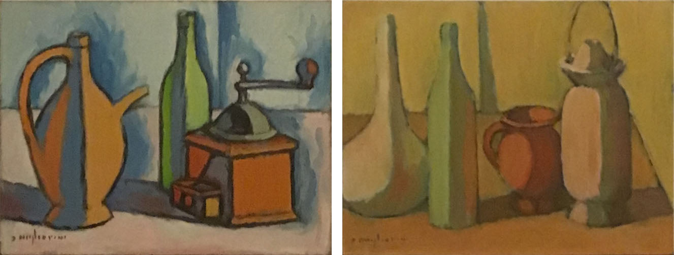 Anche il soggetto della natura morta offre a Dino Migliorini uno spunto per la sua indagine sui volumi e sulle forme geometriche. Gli oggetti vengono privati di qualsiasi caratterizzazione sensibile per essere sintetizzati in forme pure. I mezzi espressivi per compiere questa operazione sono consueti: una spessa linea nera e grosse campiture di colore. Tuttavia la stesura risulta complessa, caratterizzata da un pittoricismo carico di tensione esistenziale.
