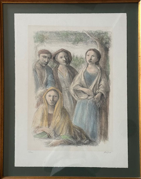 Tre donne e un uomo guardano frontalmente lo spettatore. Le figure hanno fisionomie tipiche di Purificato, con lineamenti spigolosi, sopracciglia sottili e abiti lunghi e semplici; le donne indossano un copricapo. Sullo sfondo si intravedono alberi, che aggiungono un elemento naturale alla scena. L’immagine comunica un senso di dignità e semplicità. L’opera si caratterizza per l’uso di colori miti e delicati, come il celeste, il marrone, il giallo degli abiti e il verde della vegetazione sullo sfondo. Il tratto grafico è visibile e definito, composto da tanti piccoli trattini affiancati che richiamano il disegno a matita. Questo modo di tracciare i segni crea un effetto di delicatezza e movimento, mettendo in risalto i contorni delle figure con una definizione sottile ma decisa. Domenico Purificato (Fondi 1915 – 1984) è stato un pittore italiano legato alla Scuola Romana e al neorealismo romano. Conosciuto per il suo impegno sociale, ha ritratto con sensibilità scene di vita quotidiana e figure del popolo. Oltre alla pittura, ha lavorato nel cinema e nella scenografia, collaborando con registi neorealisti e partecipando a importanti esposizioni come la Biennale di Venezia e la Quadriennale di Roma. Nel 1972 è stato direttore dell’Accademia di Brera a Milano, dove ha influenzato numerose generazioni di artisti.