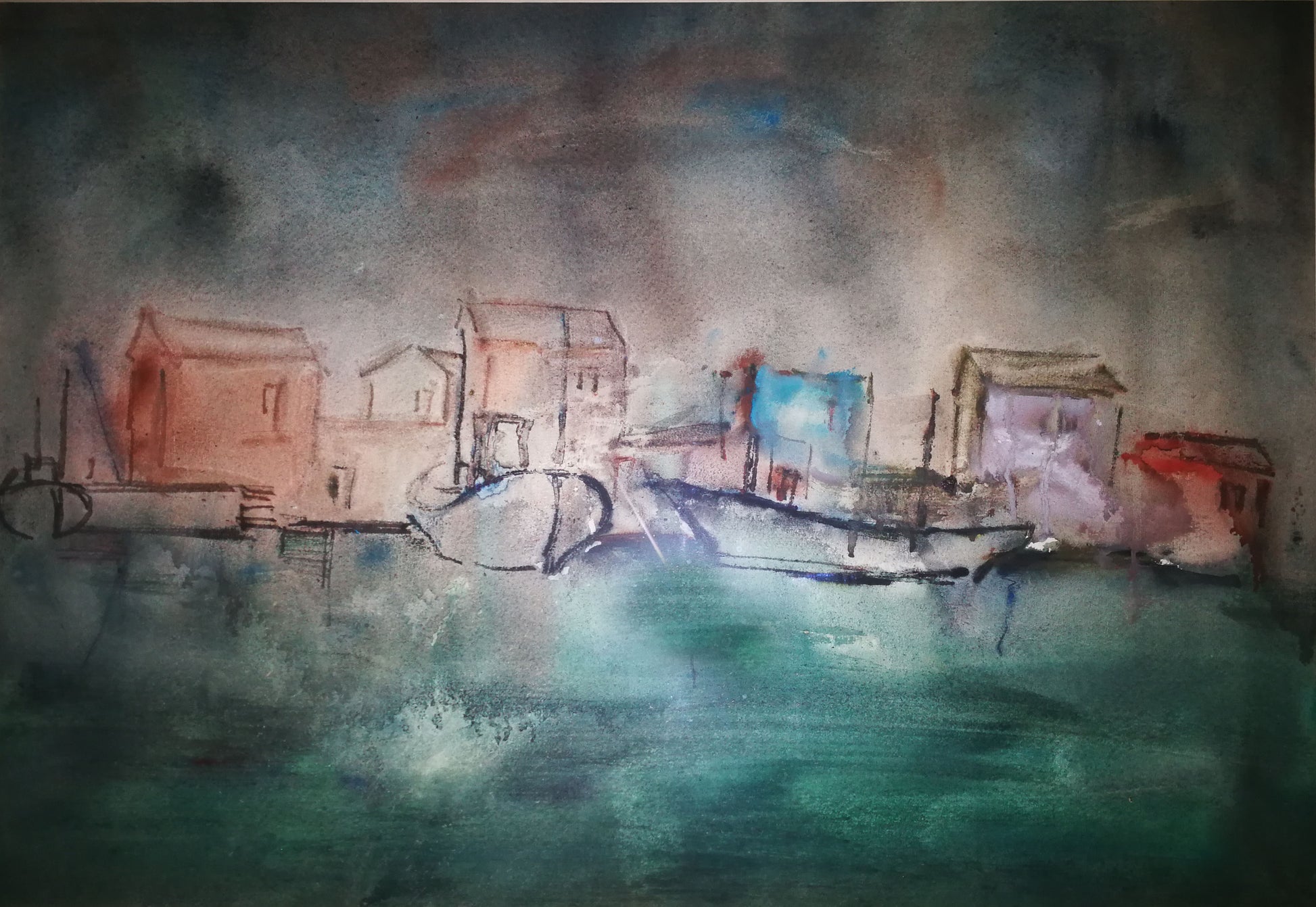 In questo acquerello il pittore Edmondo Giuliani si dimostra capace di una tecnica estremamente veloce e immediata. Con una linea corsiva ed arzigogolata riesce a rappresentare con freschezza uno scorcio urbano garantendo espressività e ritmo alla composizione. Il colore viene steso con leggere velature a coadiuvare, in modo equilibrato, l'eleganza della linea grafica.