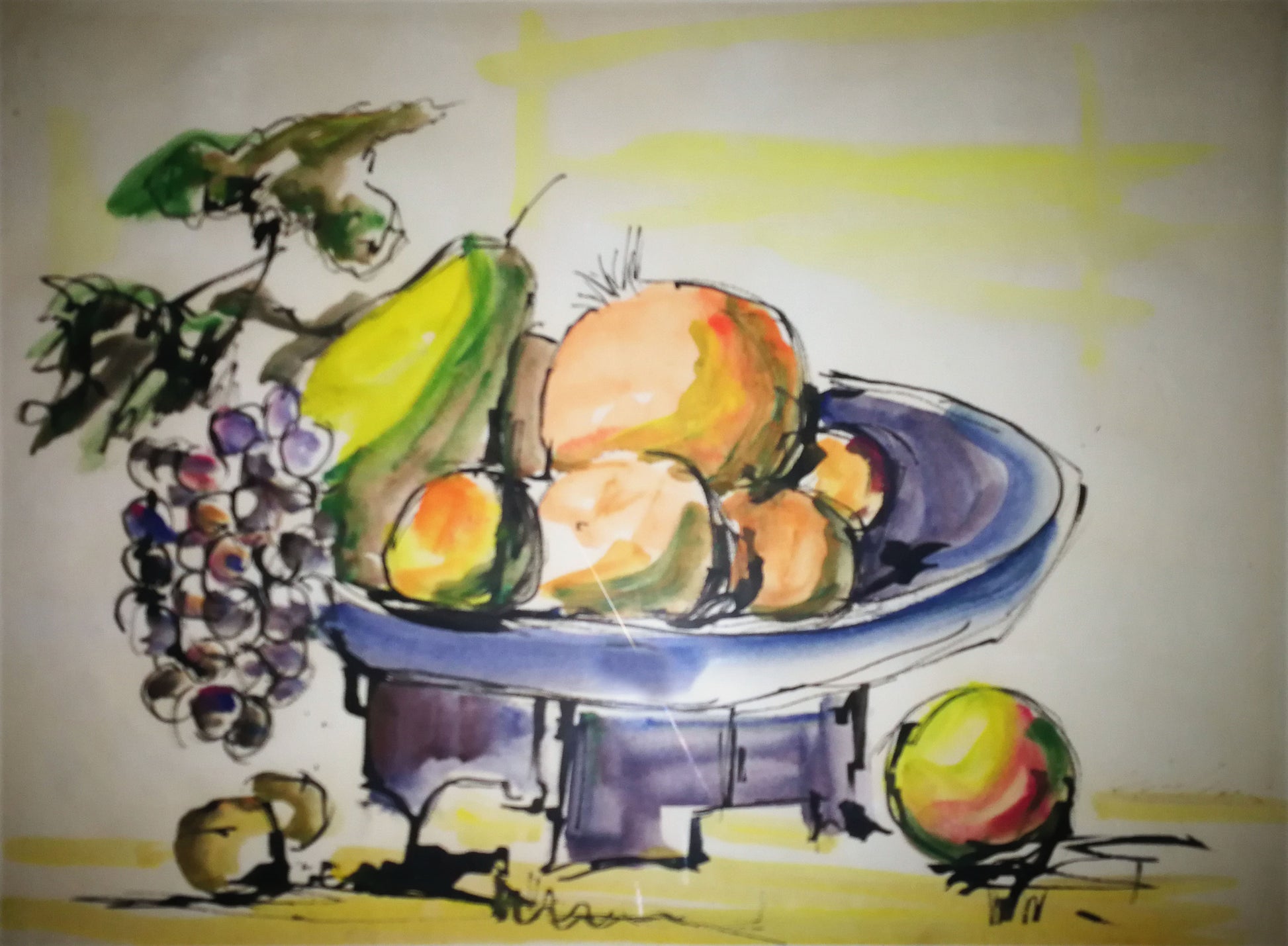 Anche nelle "nature morte" l'artista Edmondo Giuliani conferma la propria propensione alle rappresentazioni veloci e immediate, ma sempre cariche di eleganza ed espressività. Anche qui i mezzi espressivi sono la linea grafica nera che delinea le forme, in modo quasi geometrico e razionale, andando a ricercare una purezza della rappresentazione. A questa purezza si accompagna la stesura del colore ad acquerello, condotto per leggerissime e trasparenti velature, le quali riescono a restituire anche i riverberi di luce sui frutti.