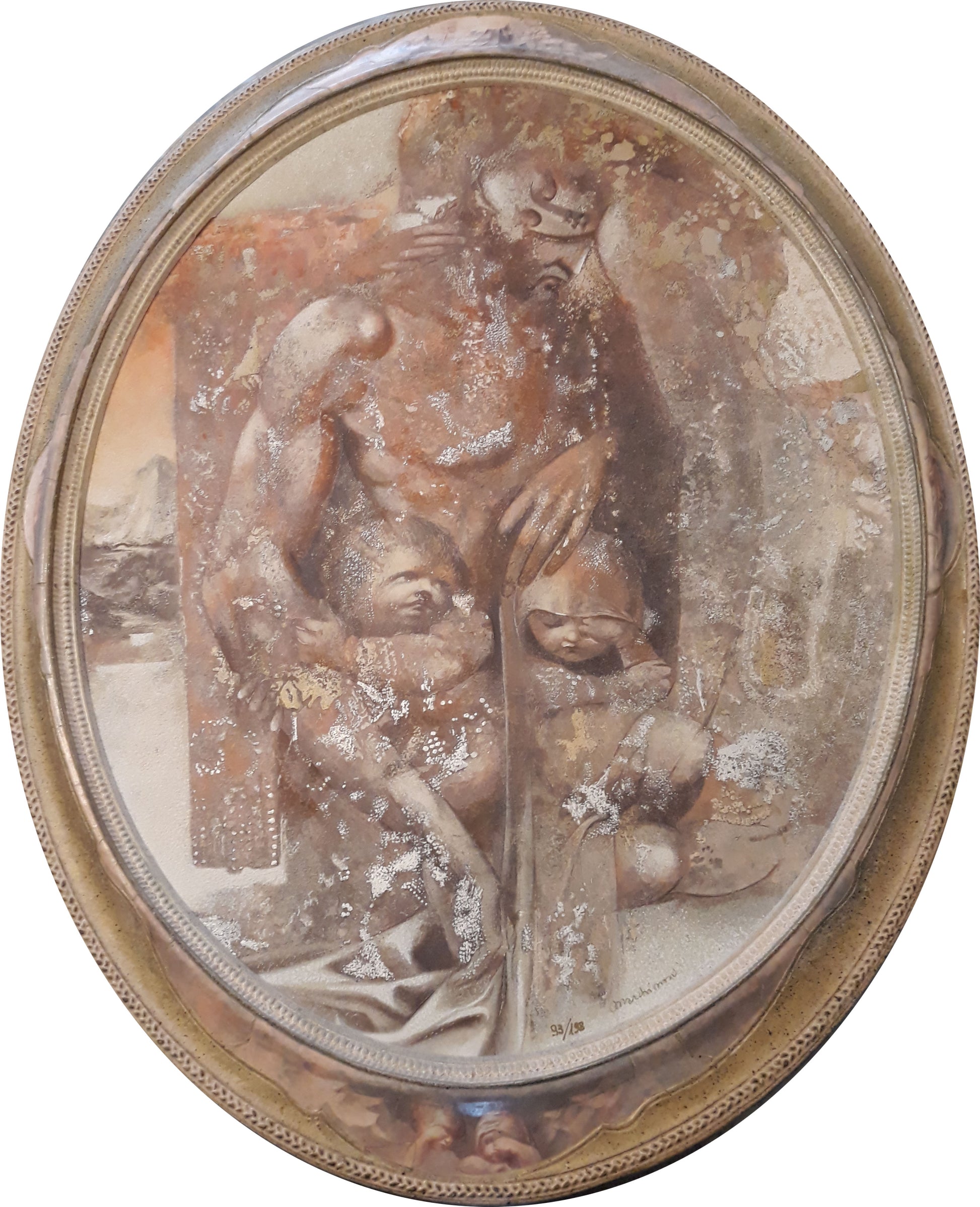 In questa versione dei suoi famosi "Strappi" Elvio Marchionni propende per una composizione, sempre ispirata al Rinascimento italiano, ma con una tendenza più marcatamente classicista. L'artista mette in opera una specie di operazione filologica tipicamente quattrocentesca o cinquecentesca, consistente nel recupero archeologico di temi dell'arte classica greca e romana. Anche la modalità interpretativa mostra un plasticismo accentuato inserito in uno spazio prospettico ispirandosi, in particolar modo in questa opera, a Michelangelo. Marchionni però rielabora il modello lavorando soprattutto sulla patina di antichità, producendo ad arte il degrado stesso dell'opera che ne aumenta il fascino ed il valore.
