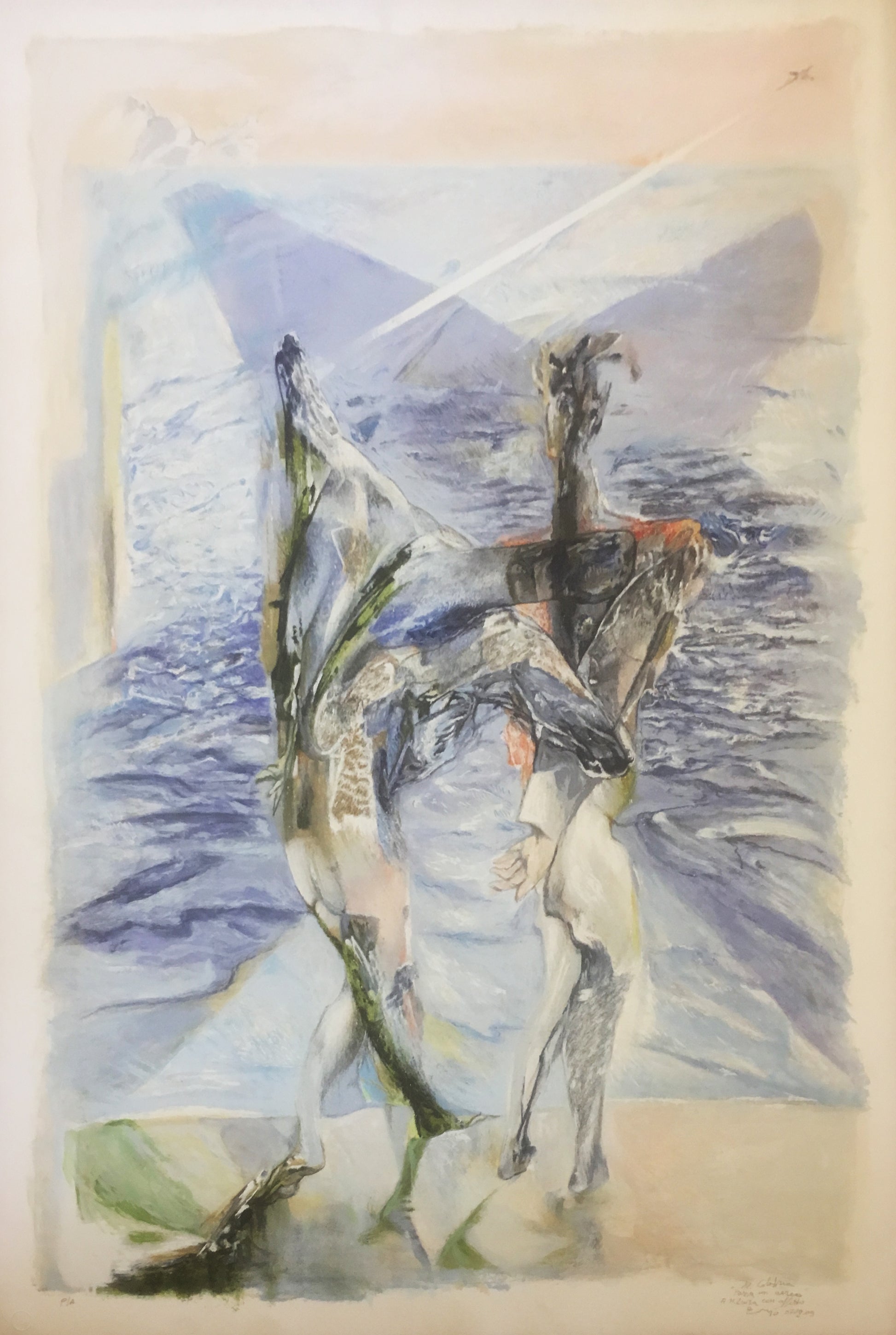 Ennio Calabria parte sempre dalla realtà fenomenica, in questo caso ci troviamo di fronte a delle figure umane davanti ad una superficie d'acqua. Ma all'artista non basta ciò che può essere percepito tramite i sensi e, per questo motivo, la realtà viene complicata in modo da poterla indagare più a fondo con una sensibilità più profonda. Ennio Calabria tende sempre verso una composizione estremamente dinamica, turbinosa, carica di un vigore espressivo quasi incontenibile. A tale scopo usa un tratto nervoso molto mosso e dal ritmo spezzato. Lo spazio viene frantumato in una simultaneità spazio-temporale che deforma gli stessi soggetti. Tutto ciò si unisce all'utilizzo del colore anche esso molto dinamico, in linea con il carattere espressionistico di tutta l'opera.