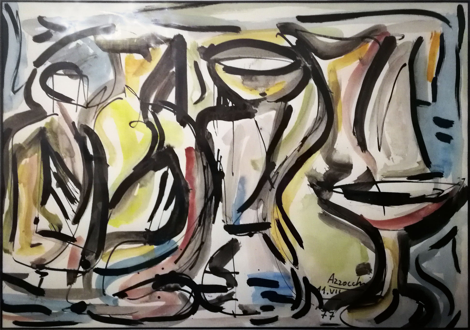 In questo acquerello Eugenio Azzocchi realizza un'opera compiutamente astratta, in cui la realtà secondo un processo di riduzione viene tradotta secondo un sistema di linee e colori. La linea nera e marcata lascia intuire la forma degli oggetti e detta il ritmo dell'opera, impostandolo su linee curve. Lo spazio tra le linee viene riempito dalle rapide pennellate di colore ad acquerello, che con sottili e trasparenti velature individuano la superficie degli oggetti e lo spazio tra di essi.