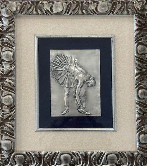 L’opera raffigura una ballerina in un momento di pausa, colta mentre si piega in avanti con naturalezza. Indossa un tutù e scarpe da danza, e la posa mette in evidenza la tensione del corpo e l’eleganza del gesto. La figura è vista di lato, con il capo abbassato e le braccia distese verso terra, in un atteggiamento che unisce concentrazione e grazia. Lo sfondo è neutro, così da concentrare l’attenzione esclusivamente sulla figura. L’opera presenta lo stile figurativo classico tipico di Francesco Messina, con particolare attenzione all’equilibrio delle forme e alla resa del movimento. Le superfici sono modellate in modo fluido e armonioso, con un tratto deciso ma essenziale. L’anatomia è trattata con precisione, ma sempre in chiave idealizzata. La scelta della tecnica del bassorilievo su argento rafforza il senso di preziosità e solidità dell’opera, pur mantenendo una leggerezza visiva in linea con il tema della danza. Francesco Messina (Linguaglossa, 1900 – Milano, 1995) è stato uno dei principali scultori figurativi del Novecento italiano. Dopo gli anni giovanili a Genova, si trasferì a Milano dove divenne docente e poi direttore dell’Accademia di Brera. La sua produzione è caratterizzata da riferimenti all’arte classica e da una continua ricerca sull’equilibrio formale. Tra i suoi soggetti più frequenti figurano cavalli, danzatrici e nudi femminili. A partire dagli anni Settanta, il tema della danza diventa centrale nel suo lavoro, espresso attraverso opere che uniscono rigore tecnico e sensibilità per il gesto e il corpo femminile.
