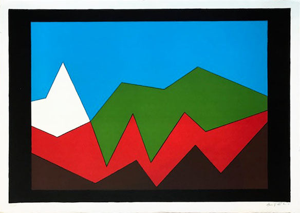 Coma Mario Schifano anche Franco angeli dà la propria interpretazione dell'immagine pop del paesaggio da cartolina. L'intervento di Franco Angeli va però in una direzione completamente opposta. Mentre Schifano ricontestualizza l'immagine tramite la sua interferenza pittorica Franco Angeli la snatura affidandola completamente alla meccanicizzazione. Il paesaggio viene ricostruito geometricamente: senza nessuna concezione alla sensibilità i profili montuosi diventano un segmento mistilineo che trova la propria bellezza in un razionale equilibrio dell'immagine e del colore.