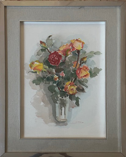 Il soggetto del dipinto è un bouquet di fiori, in particolare rose di vari colori (gialle, rosse e arancioni), disposte in un vaso trasparente. La composizione è delicata e naturale, con un effetto leggermente sfumato che richiama la freschezza dei fiori. Lo stile si caratterizza con tratti morbidi e fluidi che sfruttano la trasparenza tipica dell’acquerello. L'artista ha bilanciato dettagli e sfumature, creando un equilibrio tra la definizione delle forme e la dissolvenza dei contorni. La luce gioca un ruolo centrale, valorizzando i colori caldi dei fiori e dando profondità all'opera. Il fondo è lasciato volutamente neutro, focalizzando l'attenzione sul bouquet. G. Capponi si distingue per la capacità di catturare scene armoniose, ispirate alla natura e ai suoi dettagli delicati. Le sue opere rivelano una sensibilità cromatica, con l'uso di sfumature per trasmettere emozioni. L'acquerello sembra essere una tecnica che l'artista conosce bene e che gli permette di ottenere un risultato elegante.