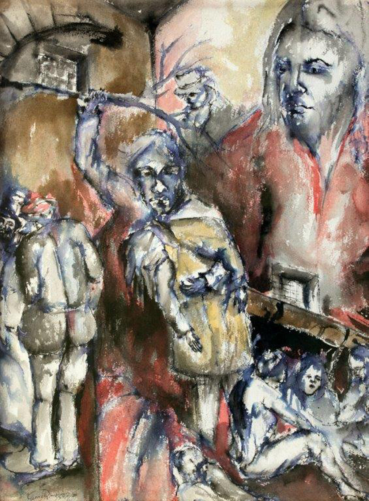 Tutte le opere della pittrice Genny Dimaggio sono indirizzate alla ricerca di un canone estetico elaborato e personalissimo. La base di partenza è sicuramente una certa influenza espressionista che si rivela nella tendenza a semplificare le forme. L'artista non si sofferma sui particolari oggettivi e va oltre trasformando i soggetti in icone. C'è, in poche parole, un esercizio di astrazione che tende ad universalizzare le forme nel nome di un'estetica che possa essere condivisa. L'uso del colore è prevalentemente simbolista finalizzato ad esprimere emotività più che naturalismo. In questo dipinto la pittrice sperimenta un Espressionismo più rude ed aggressivo. La tecnica mista di acquerello e china le permette di sintetizzare maggiormente le figure e renderle più astratte. Anche dal punto di vista coloristico la composizione vira verso tonalità più fredde rispetto a quelle usuali. Genny Dimaggio, artista pugliese nata nel 1951. Ha mostrato doti artistiche fin da piccola ma la sua formazione pittorica è avvenuta a Torino dove, oltre ad aver frequentato l'Accademia Albertina, ha fondato la galleria Il Radiante. Aperta a numerosi stimoli ed influenze ha esposto in diverse mostre in Italia e conseguito molti premi. La sua pittura è influenzata da tendenze espressioniste e simboliste.