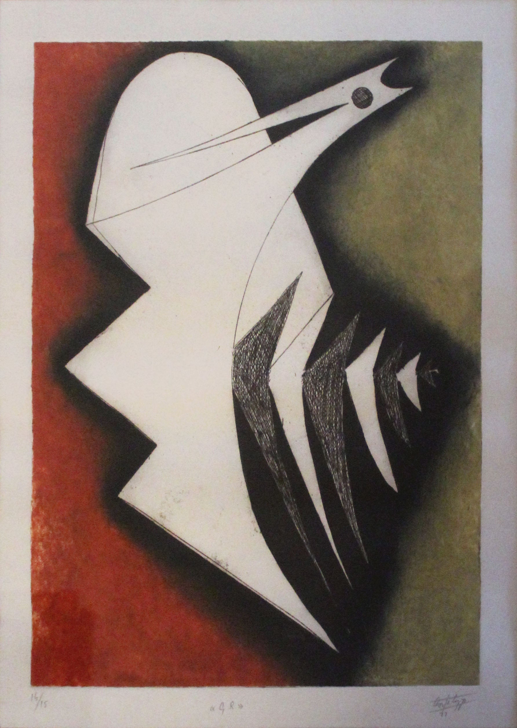 La stampa riporta un linguaggio artistico che coincide con la produzione scultorea di Gino Cortelazzo. Si tratta di un astrattismo che procede sia per forme biologiche che geometriche in composizione che presentano un accentuato dinamismo insieme ad una raffinata armonia razionale. Ovviamente, trattandosi di una stampa, qui tutto è giocato sul piano bidimensionale in una sottile ed elegante linea grafica.
