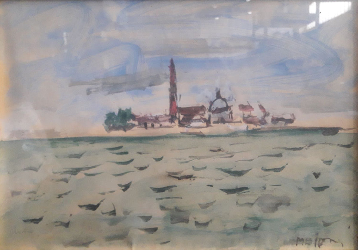 Il paesaggio è stato da sempre protagonista nella ricerca artistica, sia come ambientazione, come sfondo, ma anche come soggetto esso stesso. La descrizione naturalistica del paesaggio è stata da sempre un’aspirazione per l’artista. Ogni periodo storico ha dato la propria interpretazione del paesaggio contribuendo all’evoluzione della sua descrizione: dapprima con una ricerca sullo spazio, tramite la prospettiva brunelleschiana nel primo Rinascimento, poi sulla resa atmosferica, nel Cinquecento, fino ad arrivare alla rappresentazione di ogni singola vibrazione della luce sugli oggetti nell’Impressionismo. L'opera è un esempio significativo della serie di vedute che Meloni dedicò a Venezia. In questi acquerelli il pittore esprime una tecnica estremamente sintetica, dove anche una singola pennellata può definire una forma con carattere e coerenza. Pur avendo questa visione minimalista, sottrattiva del paesaggio lagunare, tuttavia Meloni riesce a rimanere nella tradizione più squisita del tonalismo veneziano. Tutto è determinato dal colore, imperniato su una gamma specifica, al fine di riprodurre una specifica situazione atmosferica in cui gli oggetti siano fusi in modo coerente. Sono le pennellate a costruire lo spazio e la luce che definiscono la composizione. Gino Meloni, artista nato a Varese nel 1905, si dedicò sia alla pittura che alla scultura. Formatosi all'Accademia di Brera in un primo tempo si dedicò ad un paesaggismo lombardo di stampo accademico. In seguito subì l'influenza del Cubismo e dell'espressionismo. Solo negli anni '50 trovò la sua via pittorica definitiva con la serie dei "Galli" e delle "Venezie", nelle quali definì il suo tratto estremamente sintetico ed espressivo.