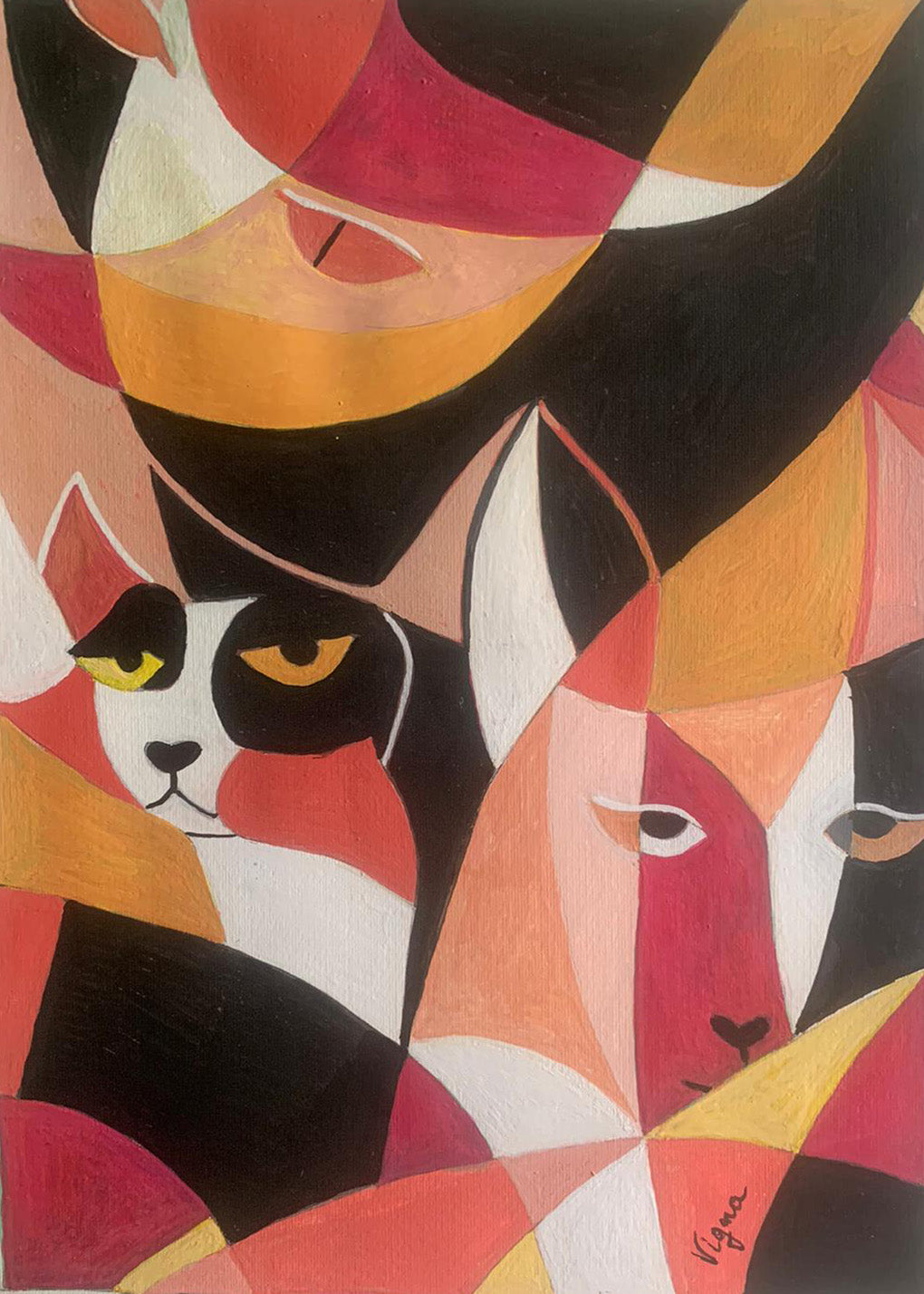 L’opera che possiamo qui apprezzare si intitola "Omaggio ai gatti", e come ci rivela il titolo intravediamo nell’insieme geometrico dei volti di gatti che traspaiono quasi come se volessero camuffarsi all’interno della superficie bidimensionale del quadro.