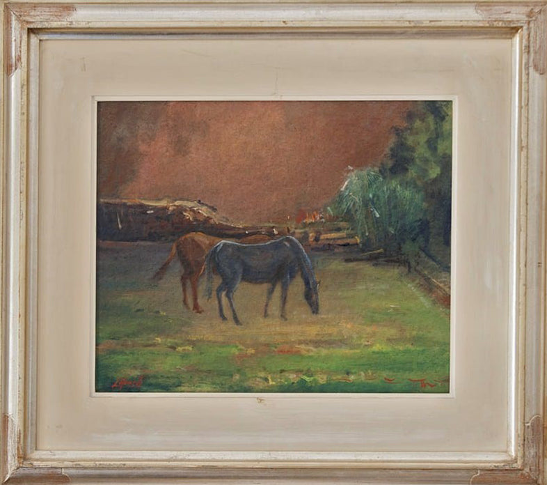 L’artista Lea Monetti, è un’acuta osservatrice della realtà. Il tema proposto dalla pittrice è quello bucolico-contadino. Lea Monetti si rileva molto attenta all’elemento naturale; infatti, il contatto con la natura selvaggia si riscontra nei suoi lavori. Il cavallo ha un significato spirituale, che rappresenta la libertà, saggezza e purezza che si manifesta nell’essenza di una corsa energica e vitale. Sebbene in questo caso gli animali vengono rappresentati in un momento di quiete, quello che salta all’occhio è la dolcezza e pacatezza del momento, data da una rappresentazione disegnativa di grande livello. Questa acuta consapevolezza disegnativa e tecnica sicuramente è stata acquisita nel tempo dalla pittrice grazie alla presenza del Maestro Pietro Annigoni, con il quale la pittrice, scultrice e designer ha avuto modo di confrontarsi durante gli anni 70’ quando segui corsi liberi dell’accademia e la “Scuola della Realtà” del Maestro presso la città di Firenze. Proprio Annigoni, appartenente al gruppo dei “pittori moderni della realtà”, dona le basi del disegno e della tecnica che lo porteranno ad essere personaggio di spicco a livello internazionale per la ritrattistica di personalità famose in tutto il mondo. Ma la pittrice riesce a far sua la tecnica per donarci un momento di vita personale e sentimentale che rispecchia la storia della vita. Se parliamo dello stile pittorico di Lea Monetti, quello che salta all’occhio è la sua riservata sensibilità al quotidiano. Lo scorcio di vita bucolica racconta il quotidiano della pittrice, facendoci immergere in una realtà intima. Dal punto di vista coloristico, non si nota uno stravolgimento di palette, e la pennellata copre omogeneamente la tela, con un’attenzione per la luce, applicando la giusta dose di lucentezza per regalare profondità all’opera. Il disegno e la pittura si compenetrano a vicenda, regalando equilibrio e senso di gentilezza alla tela. L’artista Lea Monetti vanta una vita estremante florida dal punto di vista artistico, fu pittrice, scultrice in bronzo, ritrattista, esperta in Tecniche antiche e affresco. Lea Monetti ha seguito i corsi dell’accademia di Firenze per poi passare, negli anni ’70, alla “Scuola della Realtà di P. Annigoni a Firenze. E’ stata poi assistente e restauratrice agli affreschi strappati nello studio di B.Saetti a Montepiano. Ha avuto interessanti approcci con l’arte concettuale ed il materico. Ha tenuto numerose mostre in Italia e nel mondo, per citarne alcune: Ha lavorato indipendente da gruppi, con la gall. Aldobrandeschi di E.Micheli dal 1972. Del 1980 è la monografia per la galleria S.Giorgio di Mestre presentata da M. Lucchesi e G. Viviani, dal 1988 il contratto in esclusiva con il manager G.B.Remo Bianco, famoso e stimato esperto di pittura contemporanea, ed è stata inoltre presente a tutti gli Expo e più rappresentativi dell’arte internazionale insieme ai fratelli Bueno, R.Squillantini, L.Alinari, E.Bandelli, con quotazione ufficialmente riconosciuta. Studio a Firenze e Pietrasanta. le sue opere, giacenti presso musei pubblici e privati, sono state presenti in prestigiose esposizioni unite a nomi storicizzati (Cesetti, Gentilini, Ligabue etc.)