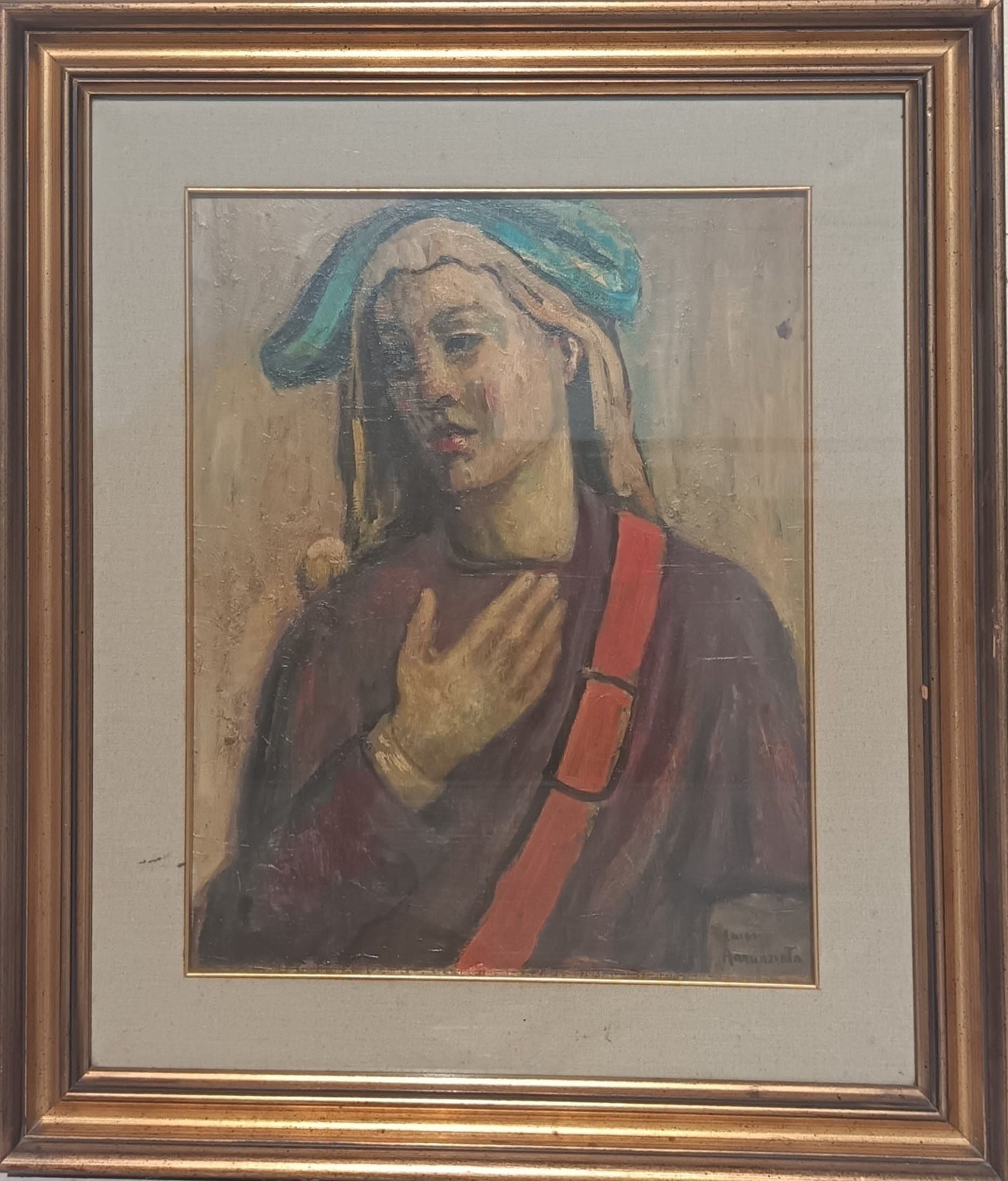 La protagonista del dipinto è una giovane donna dai lunghi capelli biondi, appena accennati con tratti essenziali. Indossa una giacca viola, un cappello celeste che le ombreggia il volto e una borsa rossa a tracolla che rompe l’equilibrio cromatico con un tocco deciso. Lo sfondo neutro, quasi sospeso, non suggerisce un luogo preciso ma accentua la concentrazione dello sguardo della ragazza, che pare assorta, forse attratta da qualcosa fuori campo. La sua espressione è seria, intensa, come se stesse vivendo un pensiero più che un momento. Luigi Annunziata adotta una pittura essenziale. I colori sono intensi ma bilanciati, usati con sapienza per costruire una composizione in cui la luce gioca un ruolo decisivo. La figura femminile emerge con forza senza bisogno di una resa iperrealista: sono le campiture cromatiche, le linee rapide e la composizione equilibrata a restituire la presenza e lo stato d’animo del soggetto. L’attenzione alla luce e alla resa emotiva supera la necessità del particolare, lasciando spazio alla suggestione più che alla descrizione. Non sono emerse molte informazioni su Luigi Annunziata, pittore e docente presso l’Istituto d’Arte di Napoli. Le poche notizie disponibili provengono da una testimonianza familiare: “Ho respirato l’odore dei colori ad olio, sono rimasto affascinato dalla forza della luce riportata sulle sue tele: è stato questo zio a darmi il coraggio per iniziare a dipingere.” Parole semplici ma significative, che restituiscono un’immagine autentica dell’artista: una figura silenziosa ma influente, capace di trasmettere la passione per la pittura.