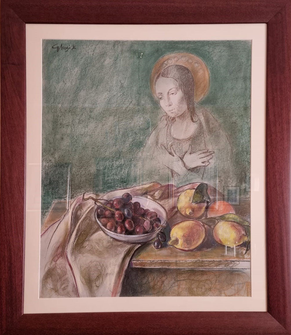 In questa opera, oltre che per la scelta tematica, Ghersi si ispira all’arte rinascimentale anche per la modalità interpretativa. Oltre a ricercare una perfetta resa naturalistica del soggetto l’artista crea una composizione perfettamente proporzionata e calibrata. L’espansione di volumi e la monumentalità della figura della Madonna, ma anche la connotazione plastica della natura morta, denotano una rivisitazione della pittura Cinquecentesca. L’interpretazione pittorica, poi, introduce volutamente una patina d’antico, come se l’opera fosse un affresco strappato recante sulla sua superficie i segni del Tempo. Tutto però ha una nuova contestualizzazione contemporanea e la composizione viene sviluppata in uno spazio complesso, multidimensionale, con un tratto vibrante e dinamico.