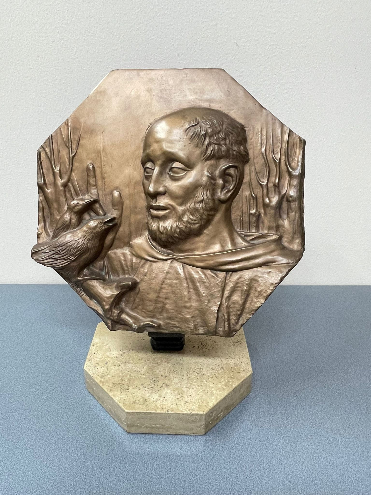 San Francesco d'Assisi è una delle figure più amate del cristianesimo, noto per la sua profonda umiltà, il rispetto per la natura e la predicazione della povertà. Fondatore dell'Ordine Francescano, rinunciò a una vita di agi per abbracciare la povertà e la semplicità. Nell'arte, San Francesco è spesso rappresentato con stimmate, mentre predica agli uccelli o in momenti di preghiera. La sua immagine ha ispirato numerosi artisti, come Giotto, che ha raffigurato la sua vita in affreschi famosi, simbolizzando l'ideale della purezza e dell'amore universale. A livello stilistico Mario Donizzetti ha una ricerca per il dettaglio non solo a livello pittorico ma in questo caso anche a livello di scultura e bassorilievo. La figura, di cui vediamo solo la testa con il collo e la mano che accarezza due uccelli, simbolo della natura. La mimesis scultorea introduce un senso di modernità e contemporaneità che guarda anche ai maestri del passato. Emerge non solo un spiccata naturalezza esecutiva ma anche una profonda sintesi psicologica dell’animo umano, trasportando la figura del santo a uomo. Mario Donizetti è un pittore italiano nato a Bergamo nel 1932. Oltre ad essere artista riconosciuto in tutto il mondo per la sua arte egli ha rivoluzionato anche il metodo pittorico proponendo nuovi metodi di lavoro come la sua tempera all'uovo verniciata e velata, il suo "encausto", il suo pastello encaustizzato. Nel 1977 fonda il “Centro di Ricerche Tecniche dell'Arte" e nel 2003 il “Donizetti Museo Scuola", inoltre l’artista divulga le sue tecniche via internet con testi in varie lingue oltre che con lezioni filmate doppiate in lingua inglese. Nel 1983 espose una sua antologica presso la Pinacoteca Ambrosiana di Milano. La sua duttilità artistica si riversò anche in campo musicale creando un nuovo metodo di scrittura musicale senza l’ausilio del pentagramma. La sua carriera artistica inoltre è costellata di premi, mostre importanti e opere permanenti come il "Crocifisso" nel Museo Tesoro della Basilica di San Pietro in Vaticano, gli affreschi e la pala d'altare nella storica Basilica di Pontida e i ritratti di grandi personaggi alcuni dei quali, come quello di Papa Giovanni Paolo II ora nella National Portrait Gallery di Washington, che sono stati pubblicati sulla copertina del TIME Magazine.