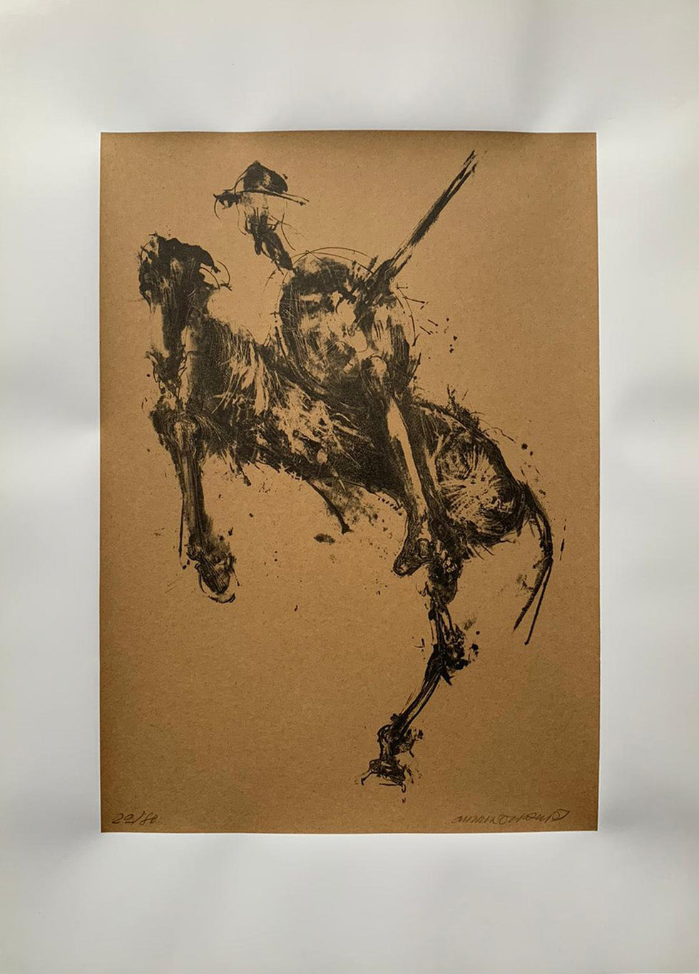 Lo stile utilizzato in questa litografia è quello tipico delle incisioni realizzate dallo scultore Marino Haupt che va ad identificarsi in un vigoroso espressionismo. La figura viene sintetizzata in maniera estrema, essa perde la sua consistenza volumetrica ed i suoi particolari fisionomici per trasformarsi interamente in una vibrazione pittorica. La forma del Don Chisciotte a cavallo viene mantenuta, ma la sostanza che la riempie è la pura gestualità dell'artista, il quale lascia fluire la proprio istintualità con un segno pittorico frenetico e dinamico. Il potenziale espressivo, unito all'eleganza della composizione, fanno di questa incisione una testimonianza straordinaria della produzione artistica di Haupt.