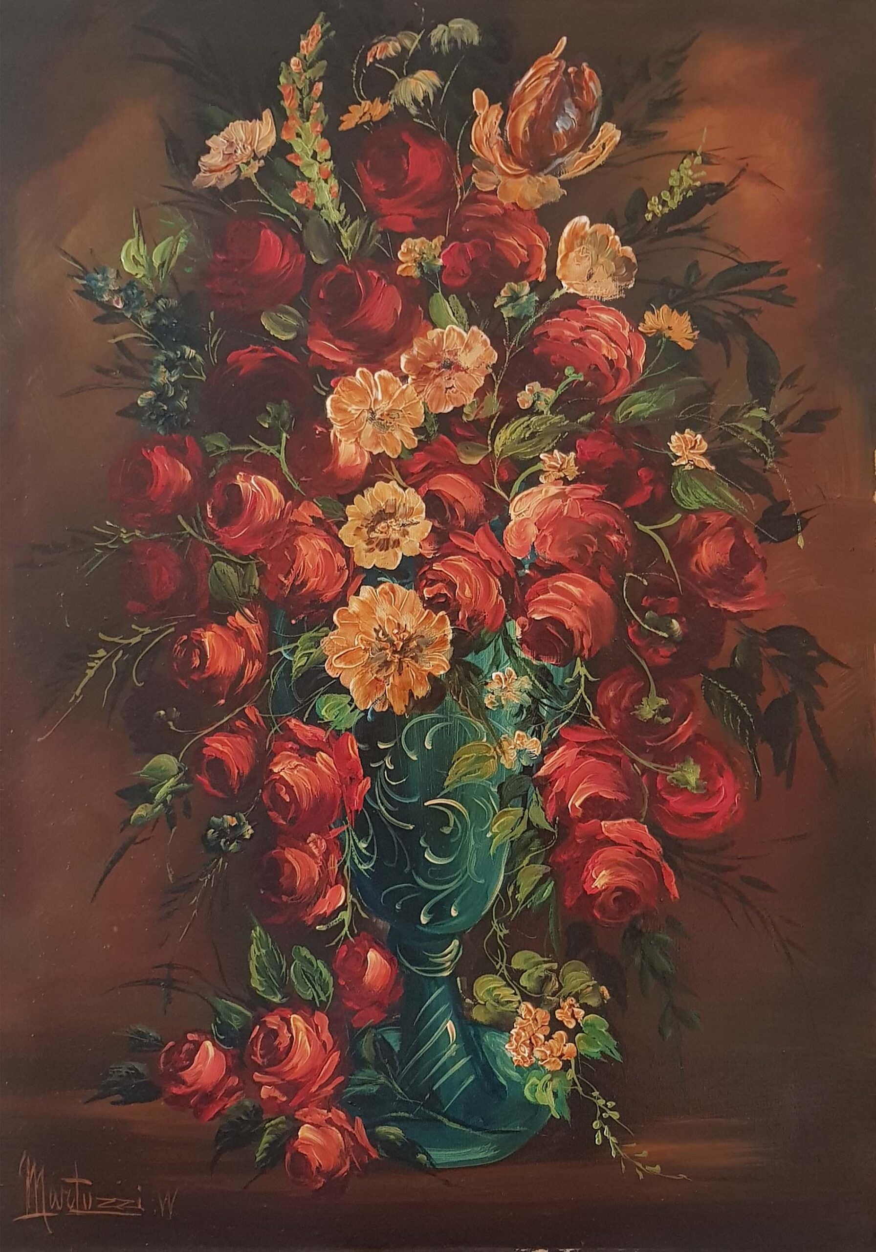 In quest’opera il pittore Walter Martuzzi mostra quanto sia elevata la sua qualità esecutiva. Questo vaso di fiori, infatti, presenta una notevole qualità formale già a partire dalla composizione congegnata secondo un complesso disegno in cui si aggrovigliano e si intrecciano forme e colori. Inoltre tutta la superficie del dipinto presenta una coerente unità atmosferica e cromatica. La luce si diffonde in modo realistico sulla scena creando brillanti riflessi sui petali rossi che il pittore registra con guizzi di colore bianco. A livello formale Walter Martuzzi usa una pennellata molto mossa di ispirazione impressionista che garantisce freschezza e immediatezza all’opera.