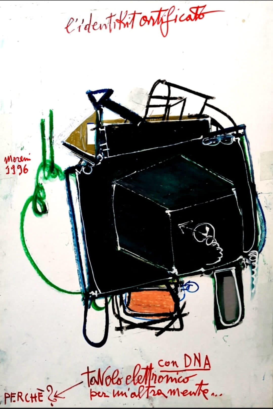 In un’opera come questa l’artista Mattia Moreni tende a superare il confine tra realtà e rappresentazione. Quella di Moreni è una riflessione sull'oggetto tecnologico, per cui lo stesso progetto diviene opera d'arte. Una sorta di ready-made, dunque, ma creato ad arte, è proprio il caso di dirlo, da Moreni. Per cui l’importanza del gesto dell’artista assume un ruolo di primo piano nella ricontestualizzazione pittorica, come negli oggetti creati da Robert Rauschenberg o da Jesper Johns. A differenza di questi ultimi, tuttavia, la gestualità espressionista astratta di Mattia Moreni viene alternata ad una sempre presente vena pop che rende queste opere originalissime nella loro vivacità.
