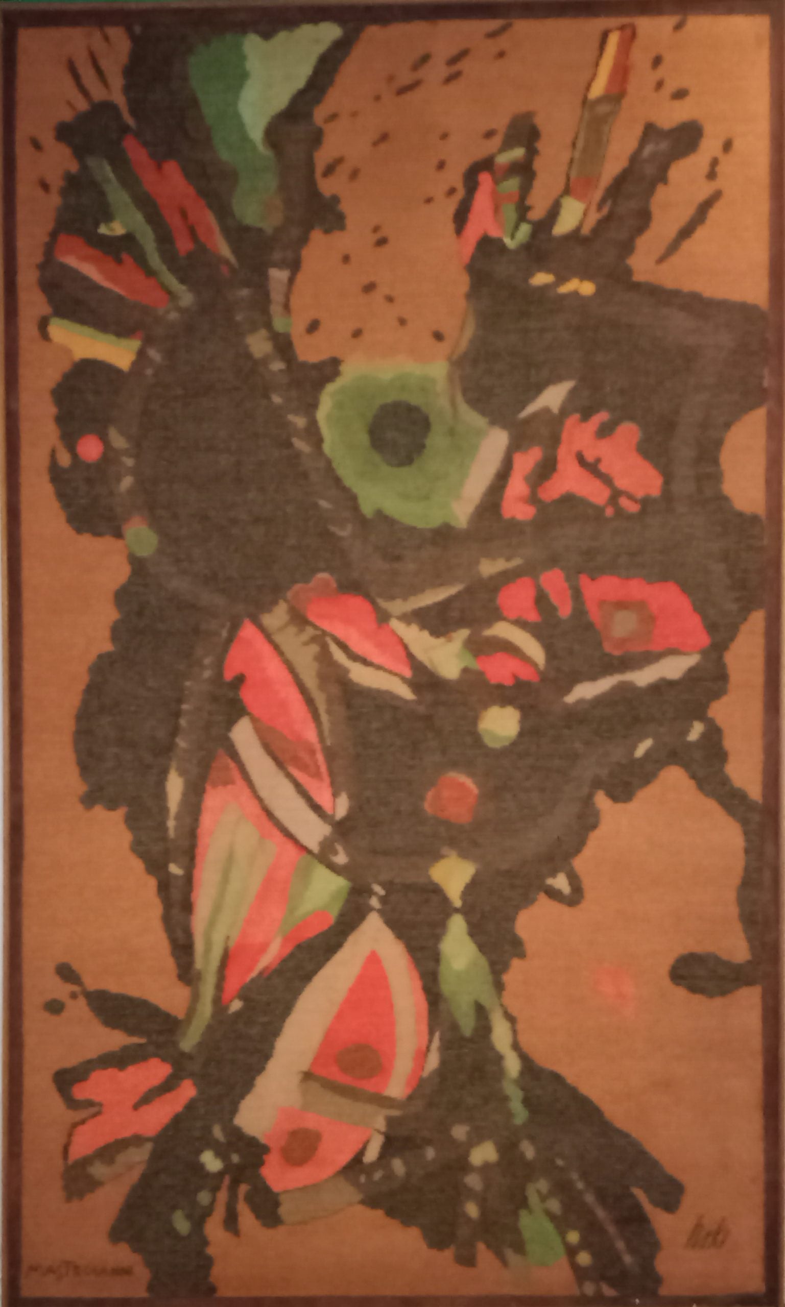 L’arazzo Niki Berlinguer, realizzato dall’artista omonima su disegno di Umberto Mastroianni, presenta una composizione astratta in cui il contrasto tra i colori crea una struttura visiva dinamica. Sebbene il disegno non raffiguri una figura riconoscibile, l’alternanza di forme ondulate e circolari suggerisce un senso di movimento fluido. Lo sfondo ocra, neutro e caldo, fa risaltare i toni più intensi del nero, del rosso e del verde, contribuendo a dare profondità all’opera. L’opera è eseguita con la tecnica del "piccolo punto", una lavorazione meticolosa che consente di ottenere superfici compatte e dettagliate. La scelta di colori e forme crea un equilibrio tra armonia e contrasto, con linee morbide che si intrecciano senza spigolosità. Il risultato è un arazzo dal forte impatto visivo. Niki Berlinguer, all’anagrafe Corinna Adelaide Augusta Fidelia, che nel 1950 sposò in seconde nozze Mario Berlinguer, vedovo e padre di Enrico - fu definita “la grande signora degli arazzi”, che realizzava con l’antica tecnica del piccolo punto, su modello di opere, forme e figure ideate da altri artisti come Carlo Levi, Corrado Cagli, Renato Guttuso, Giuseppe Santomaso.