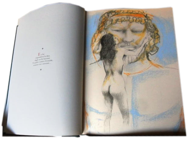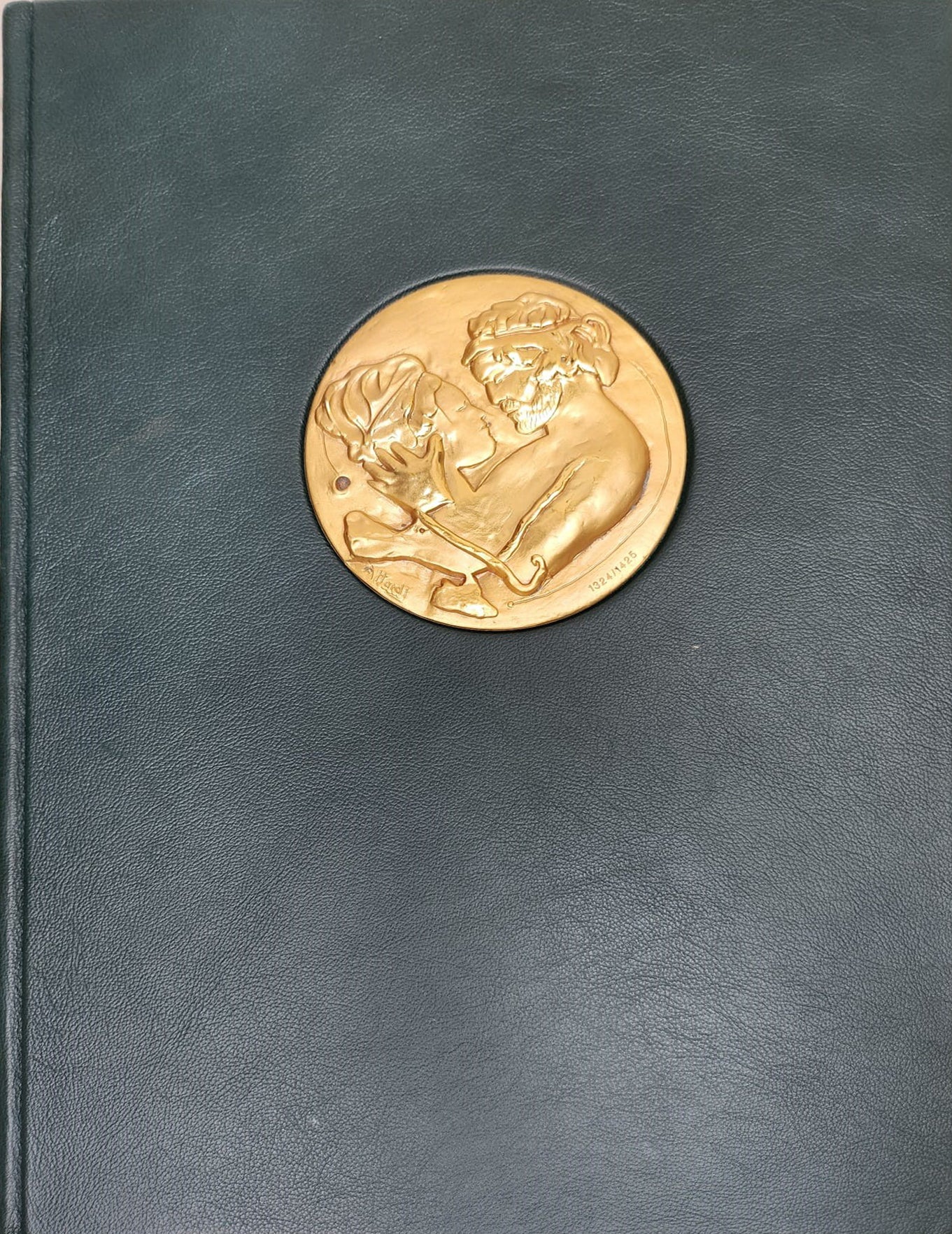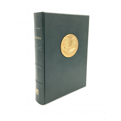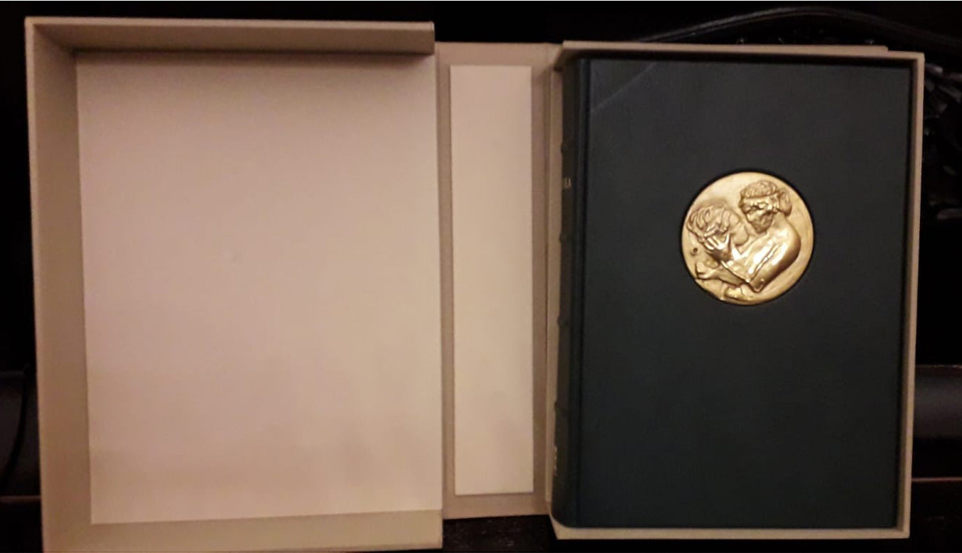 L’opera epica, tra le più importanti al mondo, attribuita al poeta greco Omero, vissuto forse tra VIII e il VII secolo a.C., canta le avventure di Ulisse (Odisseo in greco) che dopo la guerra di Troia si imbarca per un lungo ed arduo viaggio che lo riporterà presso Itaca, la sua casa. Il poema è composto da 24 libri in cui si leggono numerose digressioni a livello temporale. I temi principali che vengono trattati nell’opera sono molteplici dall’astuzia, la fedeltà, l’amore, l’ospitalità e soprattutto il destino cercando nel libero arbitrio la sua libertà di uomo, infatti, anche se gli dèi influenzano il destino degli uomini, Ulisse esercita la sua volontà e il suo ingegno per cercare di superare le sfide. Il volume ha una legatura in pelle di vitello macchiata a mano in verde con quattro nervature sul dorso, iscrizioni in oro realizzate dagli artigiani della Legatoria d’Arte “La Bottega del Legatore” di Ancona. L’opera che abbiamo il piacere di ammirare ha sul piatto di copertina un bellissimo esemplare in bassorilievo in metallo ricoperto d’oro 24k, eseguito dal maestro Ugo Attardi, in cui ha rappresentato “Odisseo e Penelope”.