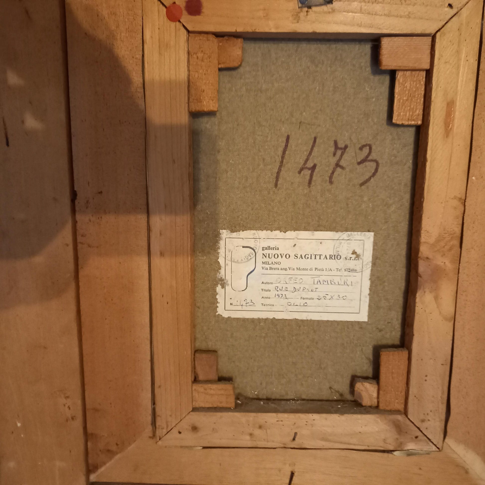 Per Orfeo Tamburi la veduta urbana Parigina, che reitera nella sua produzione pittorica, si risolve in una ricerca formale. Le strade in cui si susseguono i palazzi, con le loro linee regolari e geometriche di porte, finestre e pareti, sono un pretesto per una sistemazione razionale della realtà. Anche se lo scorcio diagonale della via concede grande dinamismo alla composizione, in Orfeo Tamburi il paesaggio urbano si esplica in un calibrato equilibrio di forme e colori che pone lo sguardo razionale dell’artista come presupposto fondamentale. I volumi degli edifici si incastrano perfettamente in un gioco di piani sovrapposti e prospettive. Ciò non toglie che i paesaggi di Orfeo Tamburi siano alimentati dalla vita e scossi da vibrazioni esistenziali. A questo scopo interviene la stesura pittorica che è, infatti, sintetica, densa di un colore materico che connota gli oggetti di vissuto.