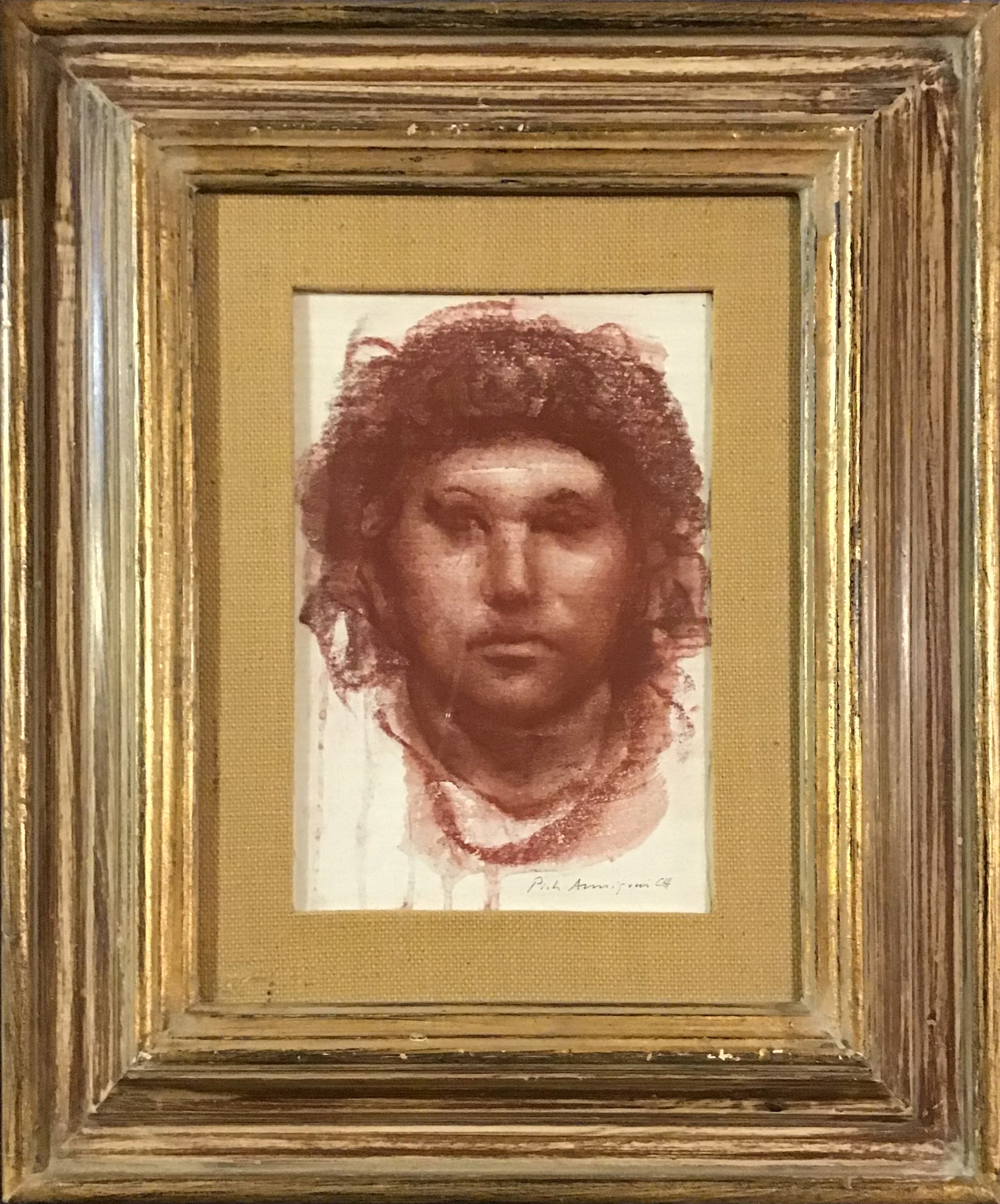 Anche in questa sanguigna di pregevole fattura possiamo ammirare la qualità tecnica del pittore Pietro Annigoni nella riproduzione della figura umana. E' un artista capace di una resa naturalistica totale, caratterizzata da un altissimo livello di purezza formale. I tratti fisionomici sono rappresentati con grande verità in una forma morbida e levigata. I contorni sono indefiniti, grazie ad uno sfumato che permette al soggetto di interagire naturalmente con lo spazio. Anche nel monocromo possiamo apprezzare, inoltre, il gioco delle ombre e delle luci che vanno a rilevare la consistenza volumetrica delle figure.