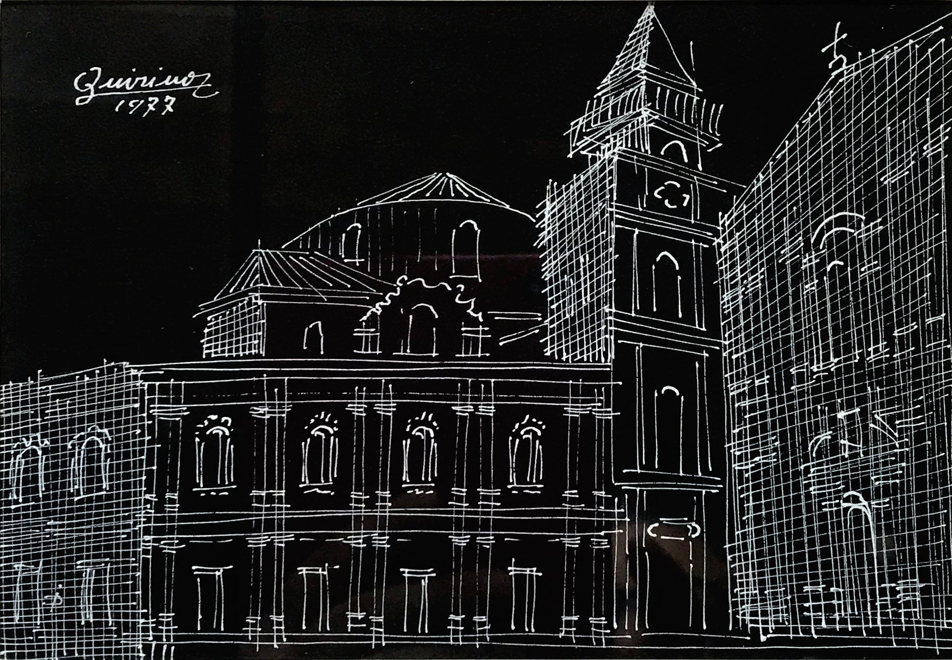 L'opera presenta una delle modalità di utilizzo della tecnica del "reticolato" di Quirino De Ieso. In questa composizione l'incrocio di linee e la scomposizione geometrica della realtà sono utili a indagare la volumetria degli oggetti e a proporla in maniera enfatizzata. La purezza delle linee risalta sul fondo nero e la diversa regolazione della griglia distingue le zone d'ombra da quelle di luce.